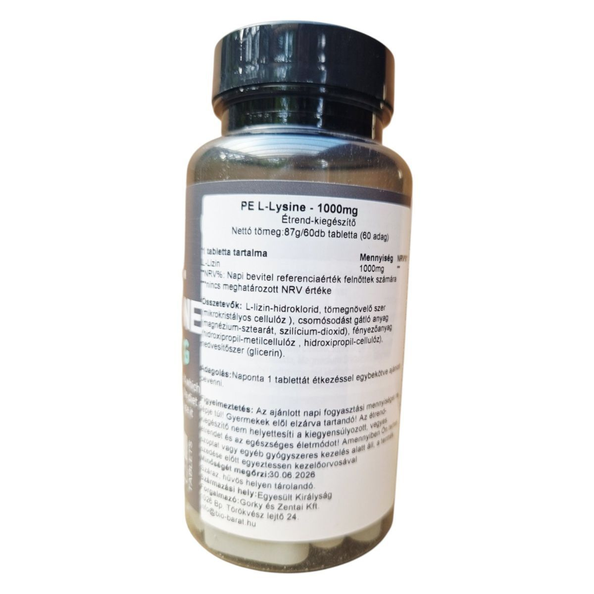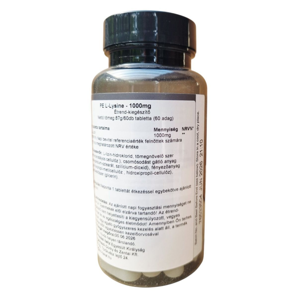 A PE NUTRITION L-LYSINE 1000mg egy étrend-kiegészítő, amely esszenciális aminosavat, L-Lizint tartalmaz. Ez az aminosav fontos szerepet játszhat a szervezet fehérjeszintézisében és az immunrendszer támogatásában. A termék vegán étrendbe illeszthető, és napi egy tabletta fogyasztása ajánlott étkezéssel együtt. Az étrend-kiegészítő nem helyettesíti a kiegyensúlyozott étrendet és az egészséges életmódot. A terméket száraz, hűvös helyen kell tárolni, és gyermekek elől elzárva tartani. A gyártó a Törökverő és Zentai Kft., amelynek székhelye Budapesten található.