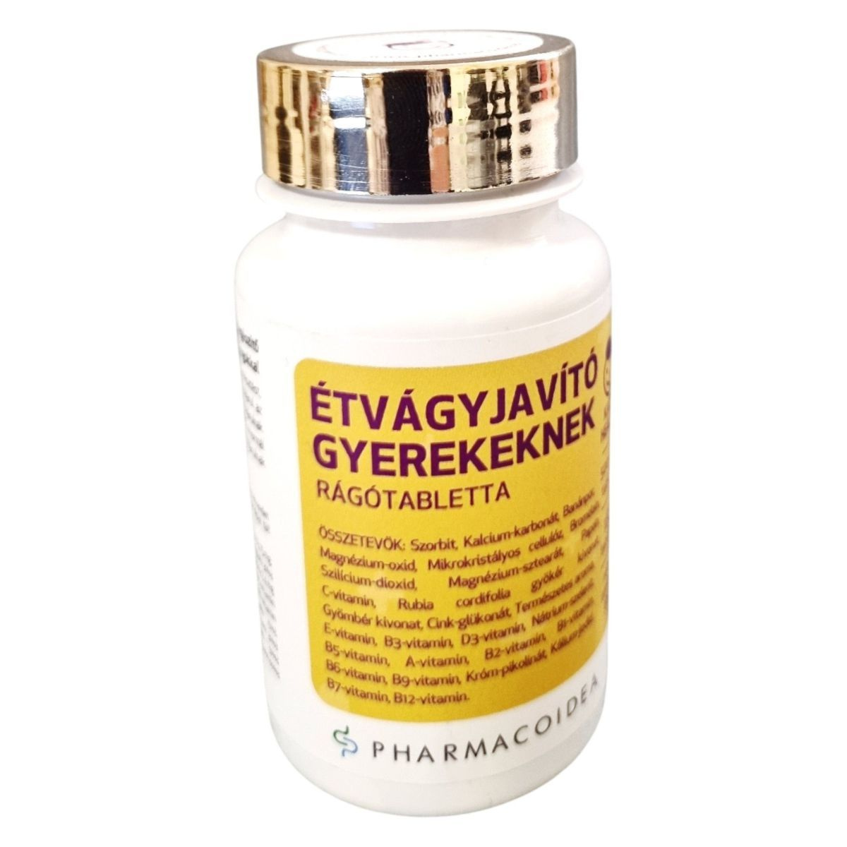 Az Étvágyjavító Gyerekeknek rágótabletta célja, hogy támogassa a gyermekek étvágyát és emésztését. A termék különféle vitaminokat és ásványi anyagokat tartalmaz, amelyek hozzájárulhatnak a bélrendszer normál működéséhez és a makrotápanyagok anyagcseréjéhez. A termék 180 tablettát tartalmaz, és a Pharmacoidea Kft. gyártja. A Rubia cordifolia és gyömbér kivonatok mellett a tablettákban található kalcium, cink, B-vitaminok és más fontos tápanyagok is. A termék használata nem helyettesíti a kiegyensúlyozott étrendet és az egészséges életmódot.