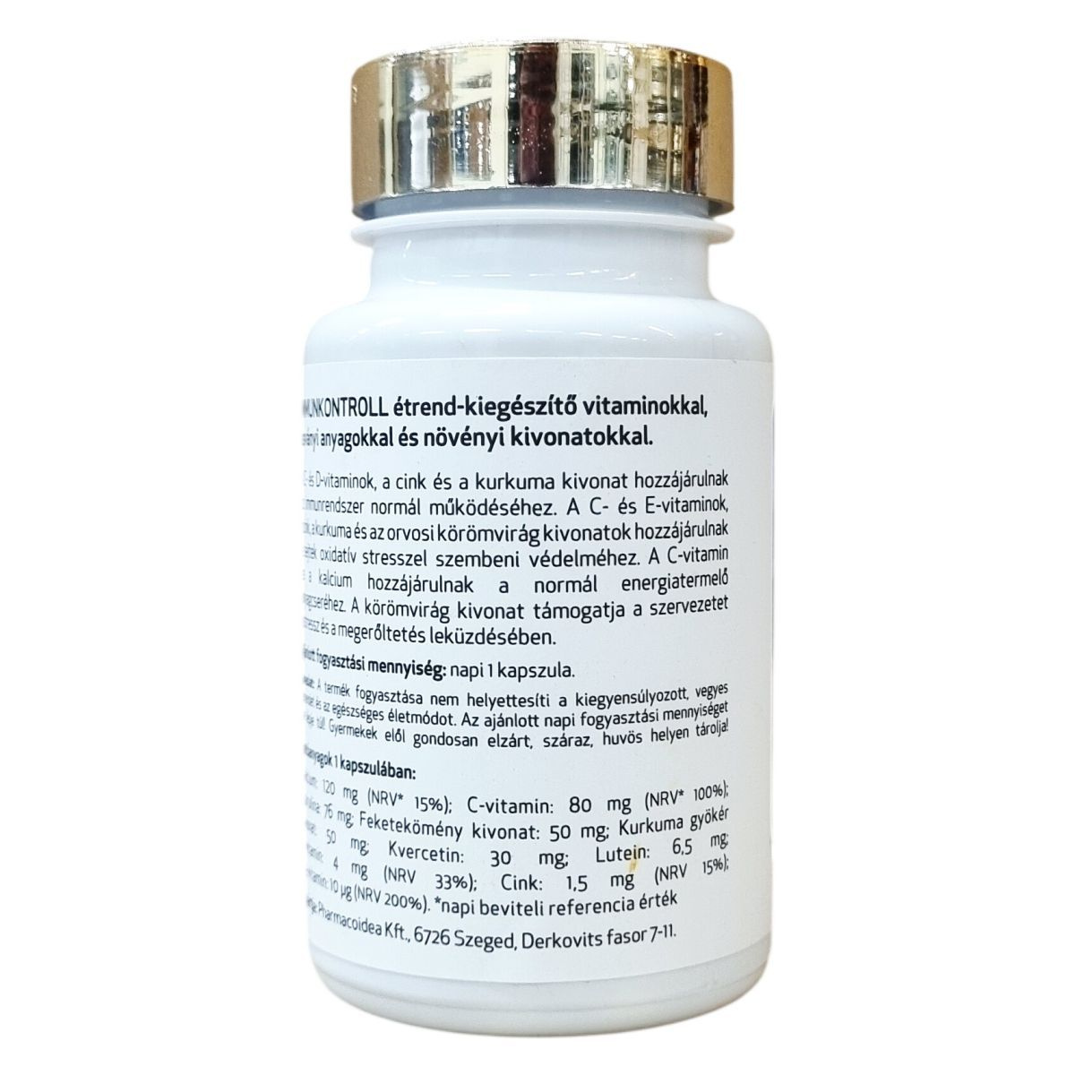 Az IMMUNKONTROLL étrend-kiegészítő C- és D-vitaminokat, cinket, kurkuma- és orvosi körömvirág kivonatokat tartalmaz, melyek hozzájárulhatnak az immunrendszer normál működéséhez és a sejtek oxidatív stresszel szembeni védelméhez. E-vitamin és kalcium jelenléte támogathatja a normál energiatermelő anyagcserét. A körömvirág kivonat a stressz és megerőltetés leküzdésében támogathatja a szervezetet.