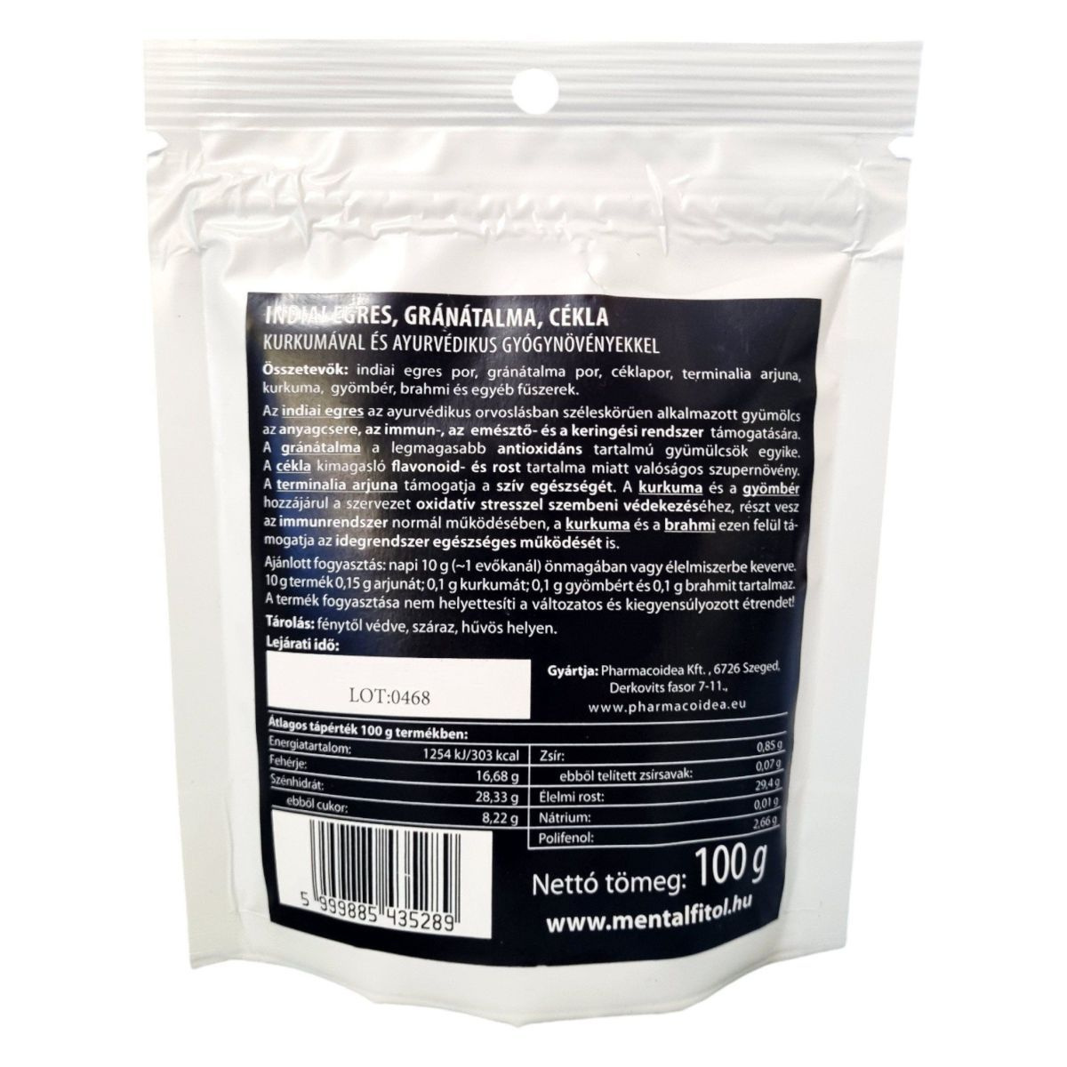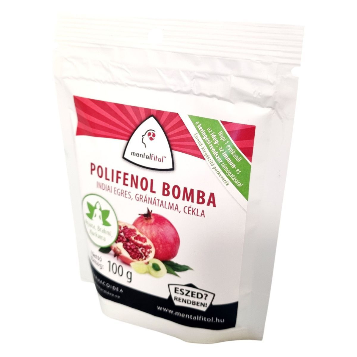 A mentalfitol™ POLIFENOL BOMBA egy 100 g-os étrend-kiegészítő porkeverék, amely indiai egres, gránátalma és cékla alapú összetevőkkel készült. Az ayurvédikus orvoslásban is használt indiai egres az anyagcsere, az immun-, az emésztő- és a keringési rendszer támogatására szolgálhat. A gránátalma magas antioxidáns tartalmával, míg a cékla flavonoid- és rosttartalmával járulhat hozzá az egészség megőrzéséhez. A termék tartalmaz továbbá arjunát, kurkumát, gyömbért és brahmit, amelyek az ideg- és a szív- és érrendszer egészségét támogathatják. A termék napi ajánlott mennyisége 10 g, amelyet önmagában vagy élelmiszerbe keverve fogyaszthatunk.