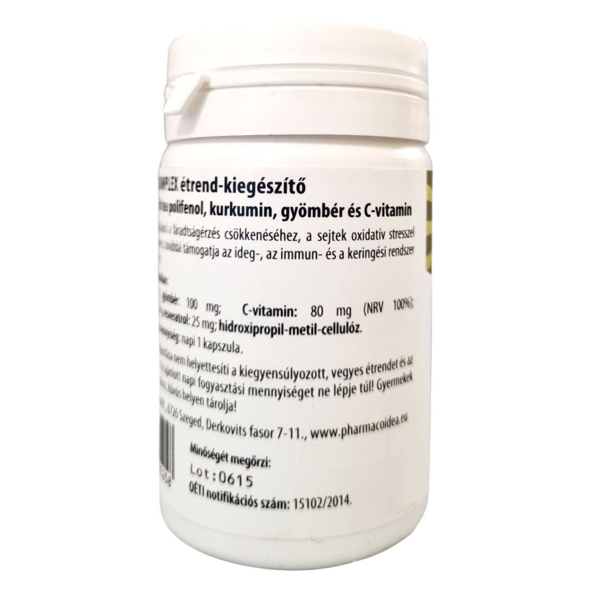 Ez a termék resveratrolt, zöld tea polifenolt, kurkumint, gyömbért és C-vitamint tartalmaz, amelyek hozzájárulhatnak a fáradtságérzés csökkenéséhez, a sejtek oxidatív stresszel szembeni védekezéséhez, és támogathatják az ideg-, az immun- és a keringési rendszer egészséges működését.