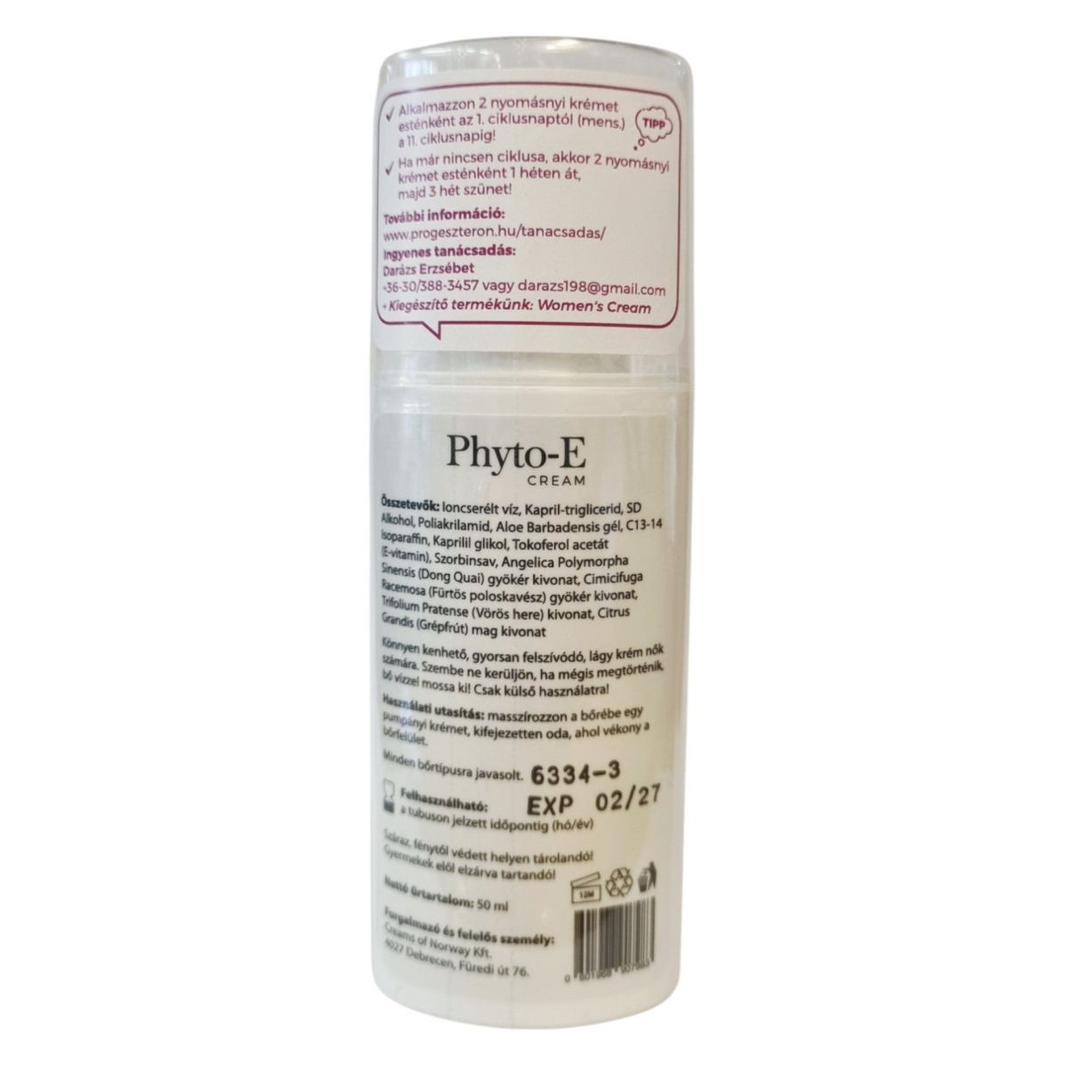 A Phyto-E Cream for women egy speciálisan nők számára kifejlesztett krém, amely könnyen kenhető és gyorsan felszívódik. Az alkalmazás módja a menstruációs ciklushoz igazodik, de ciklus nélküli használat esetén is van javasolt alkalmazási rend. A termék összetevői között megtalálható az E-vitamin és különböző növényi kivonatok, mint például a Dong Quai és a Vörös here. A krém minden bőrtípusra javasolt, de fontos, hogy szembe ne kerüljön, és csak külsőleg alkalmazható. A termék tárolása száraz, fénytől védett helyen ajánlott, és gyermekek elől elzárva tartandó. További információkért és ingyenes tanácsadásért látogasson el a www.progeszteron.hu/tanacsadas/ oldalra vagy vegye fel a kapcsolatot Darazs Erzsébettel.