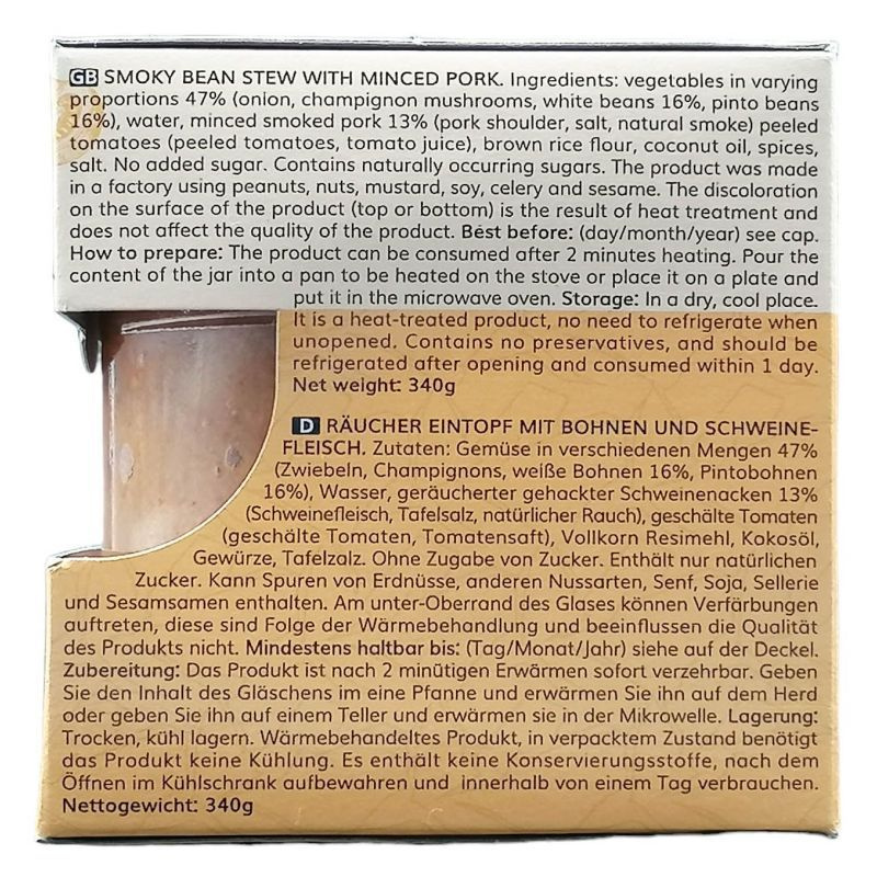 Összetevők: bab, darált füstölt tarja, hagyma, paprika, só, fűszerek.