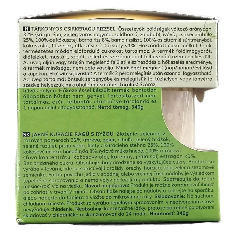 Összetevők: csirkehús, rizs, víz, tárkony, só, fűszerek.