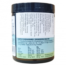 Citrom és lime ízű elektrolitpor. Édesítőszert (szteviol-glikozidok) tartalmaz. Fő összetevő származási helye: Európai Unión kívüli. Gyártva Finnországban. Nettó tömeg: 120 g. 24 adag. Vonalkód: 6430039222601.
