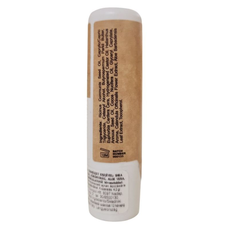 Shea vaj, kókusz olaj, körömvirág, aloe vera, E-vitamin, kandelillaviasz kivonatokkal. A száraz, kicserepesedett ajkak ápolására természetes összetevőkkel.