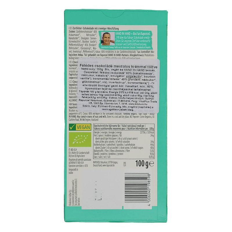 Fedezd fel a félédes csokoládé és a friss borsmenta krém tökéletes harmóniáját! Ez a bio, vegán édesség 60% kakaótartalommal és ellenőrzött ökológiai gazdálkodásból származó összetevőkkel készült, így ízletes és tudatos választás.