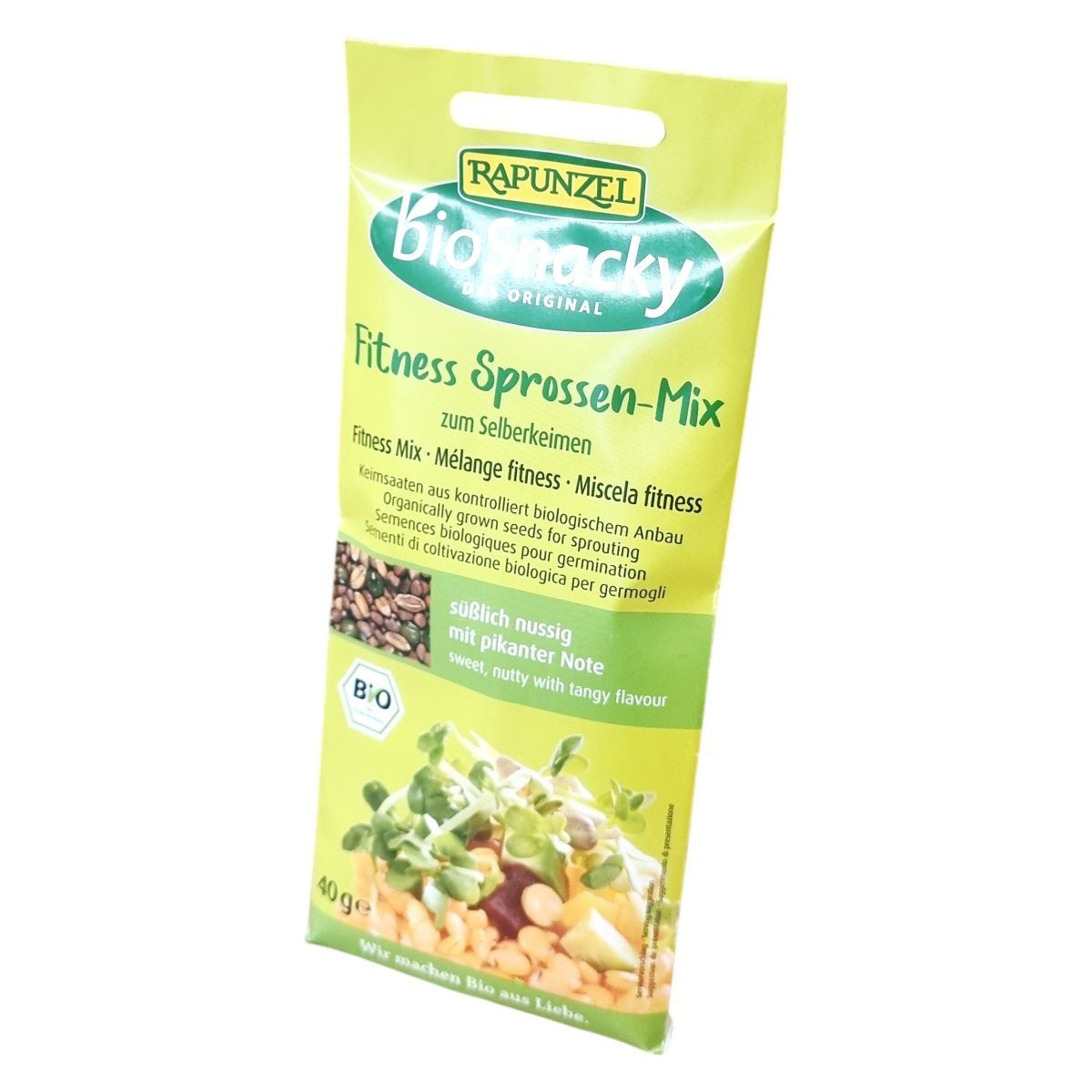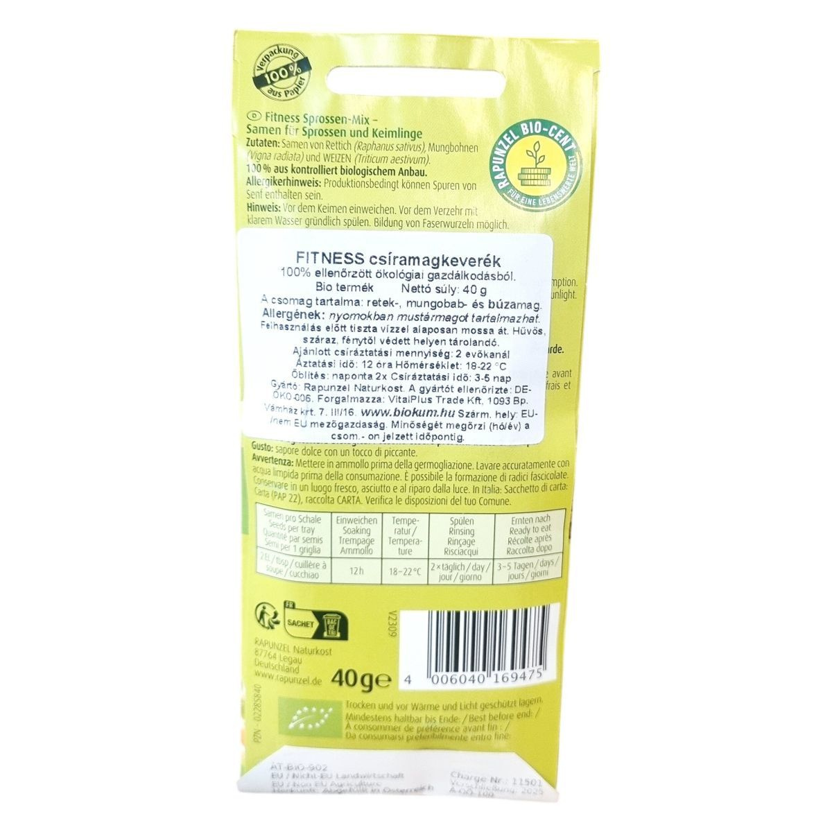 A RAPUNZEL bioSnacky Fitness csíramagkeverék kontrollált ökológiai gazdálkodásból származó magvakból áll, így támogatja az egészséges életmódot organikus és természetes módon. A csomag papírból készült, környezetbarát csomagolás, amely 100% újrahasznosítható. A magkeverék ideális csíráztatásra, ajánlott mennyiség 2 evőkanál, optimális csíráztatási körülmények mellett gyorsan és egyszerűen friss, tápanyagban gazdag csírák állíthatók elő, melyek enyhén édes, diós ízűek, pikáns aromával. Az összetevők között retek, mungóbab és búza mag található, melyet felhasználás előtt áztassunk be és rendszeresen öblítsünk. A kész csírák fogyasztása egészséges, azonban allergiásoknak figyelembe kell venniük a mustár esetleges nyomok jelenlétét. A termék származási helye EU és nem EU mezőgazdaság.