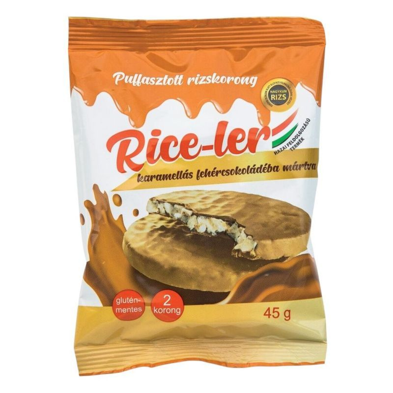 A mártott rizskorongok, minőségi belga karamellás fehércsokoládéval vannak teljesen bevonva.