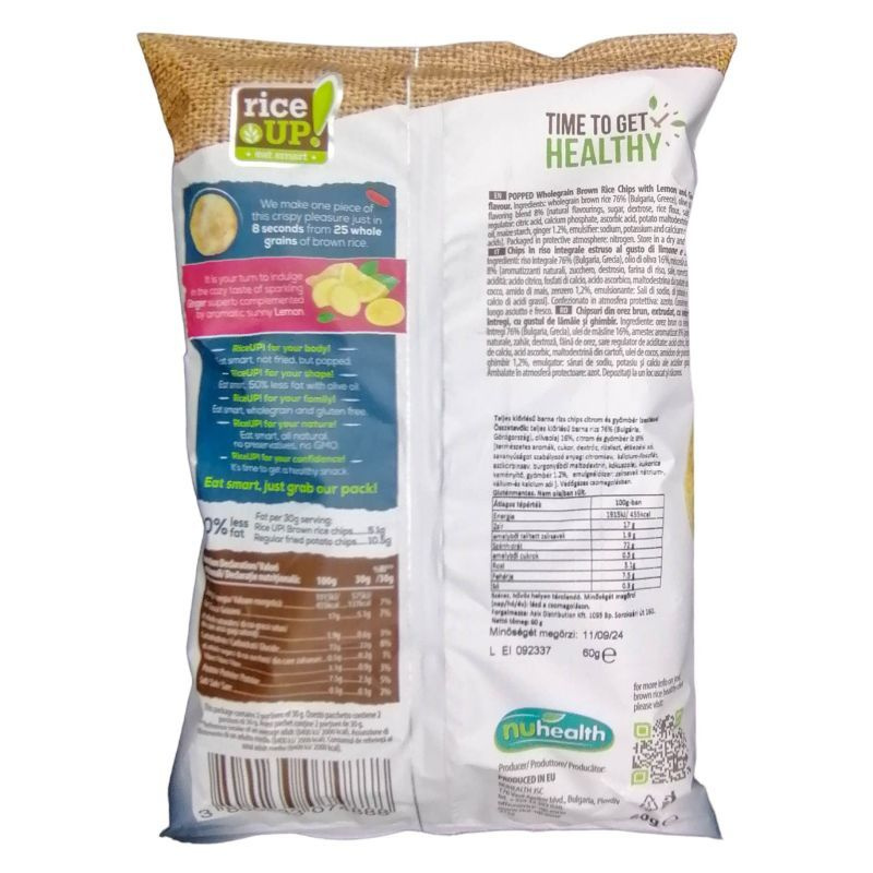 Fedezd fel a ropogós, gluténmentes barna rizs chips különleges ízét, amely citrom és gyömbér frissítő kombinációjával kényeztet. Az olajban nem sült snack tökéletes választás egészséges nassoláshoz!