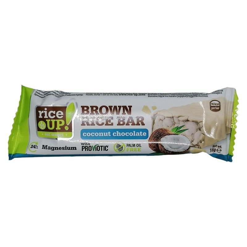 Rendkívül ropogós, gluténmentes rizsszelet teljes kiőrlésű barna rizsből, kókuszis ízű lágy fehércsokoládéval bevonva.