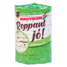 Teljes mértékben adalékmentes: válogatott minőségi alapanyagokból készül. Zöldfűszeres ízesítésben puffasztott barna rizs korongok. Felhasznált adalékmentes fűszerek: bazsalikom, oregánó, rozmaring és tárkony. Diétás étrendbe is javasolt. Béltisztító és méregtelenítő hatású. Jótékonyan hat a vérzsír- és a koleszterinszintre, néhány tápláló szelet elfogyasztása után jelentkezik a teltségérzet.