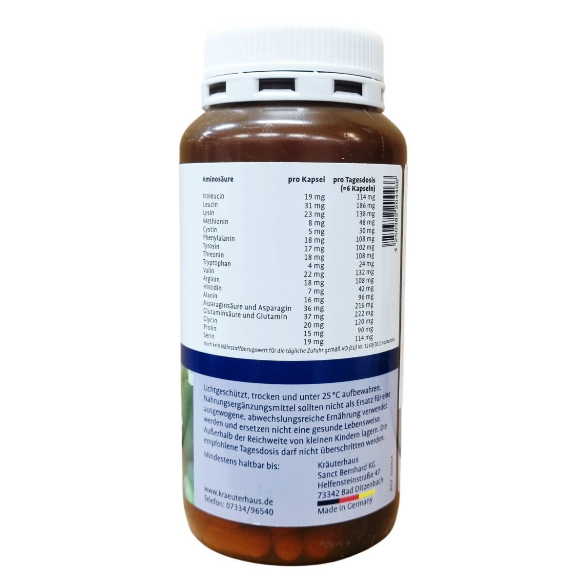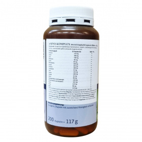 Az Amino-Komplex kapszula egy németországi gyártású étrend-kiegészítő, amely aminosavak széles skáláját tartalmazza, beleértve az esszenciális és nem esszenciális aminosavakat is. Minden kapszula burgonya tojásfehérje hidrolizátumot tartalmaz, amely könnyen felszívódó fehérjeforrás. A termék 200 darab kapszulás kiszerelésben, 117 gramm nettó súllyal érhető el. Az aminosavak mennyisége hat kapszulánként került megadva, amely felel meg a napi ajánlott mennyiségnek a gyártó utasítása szerint. A kapszulák zselatinból készülnek, töltőanyagként mikrokristályos cellulózt tartalmaznak, illetve csomósodásgátló anyagként zsírsavak magnéziumsóit alkalmazzák. Felhívjuk a figyelmet arra, hogy a termék nem helyettesíti a változatos és kiegyensúlyozott étrendet, valamint az egészséges életmódot, és nem ajánlott gyermekek számára. Ajánlott adagolási javaslat szerint naponta három alkalommal két kapszulát szükséges bő folyadékkal bevenni, főétkezések előtt. A termék tárolása száraz, fénytől védett helyen, 25 Celsius-fok alatt történjen.