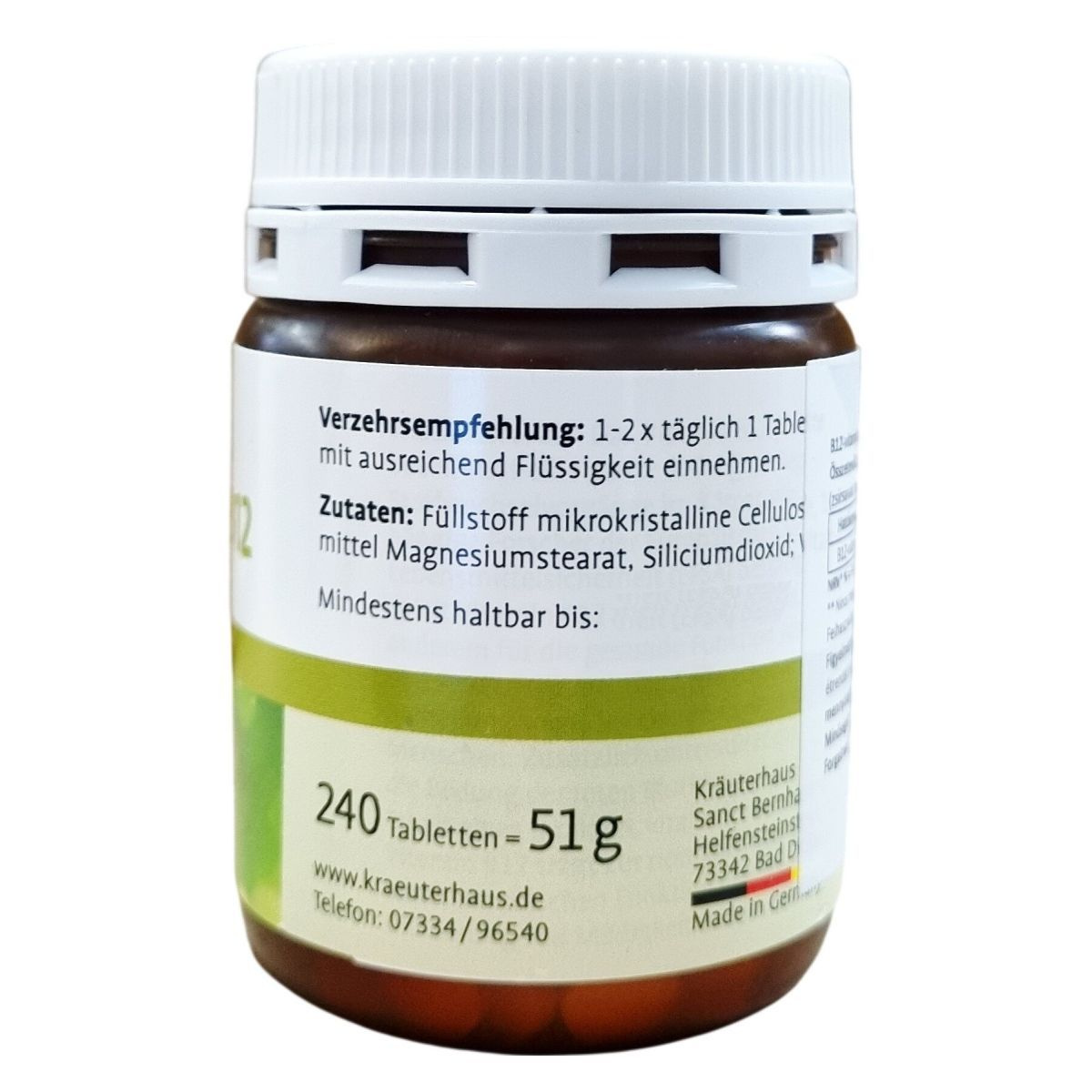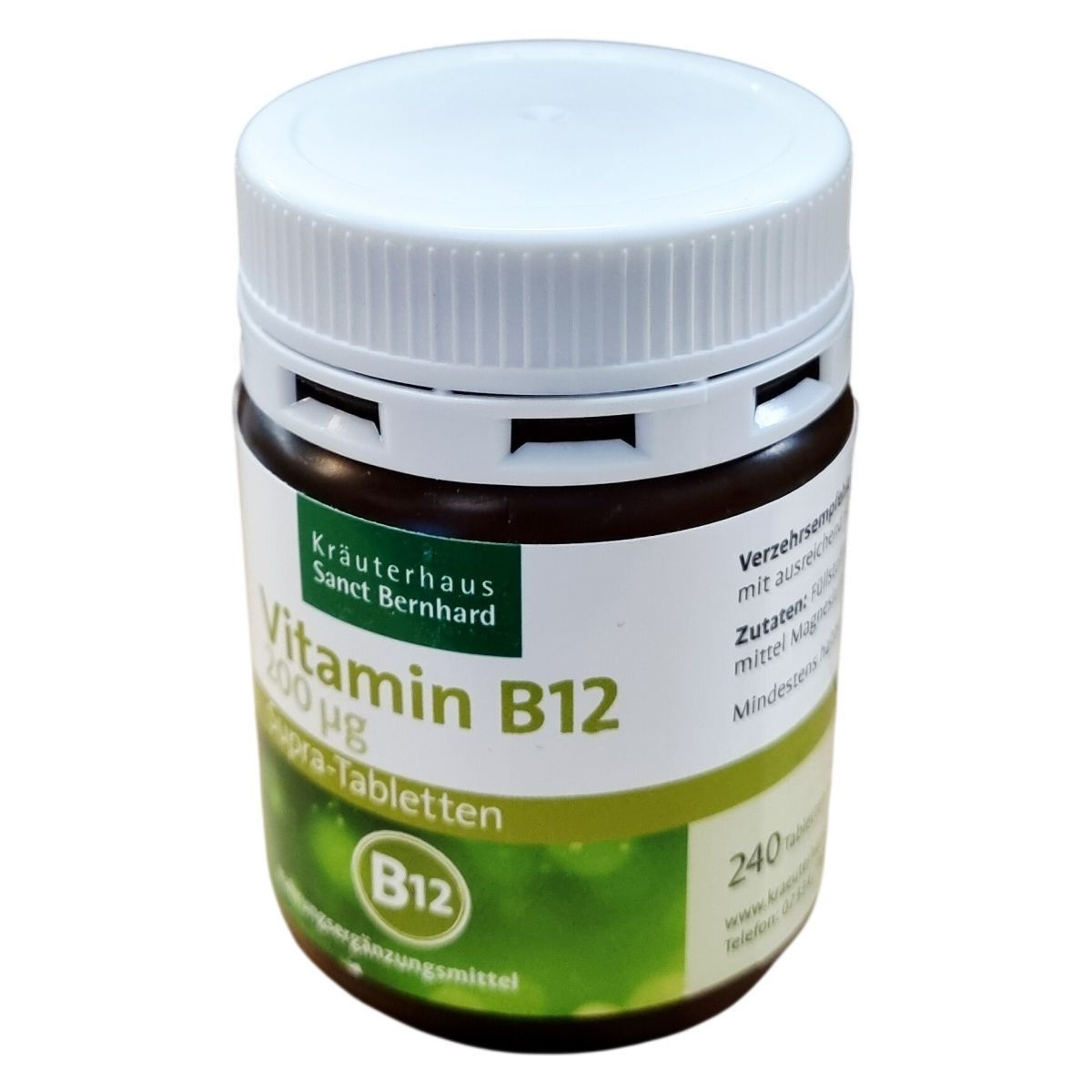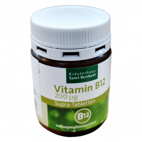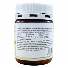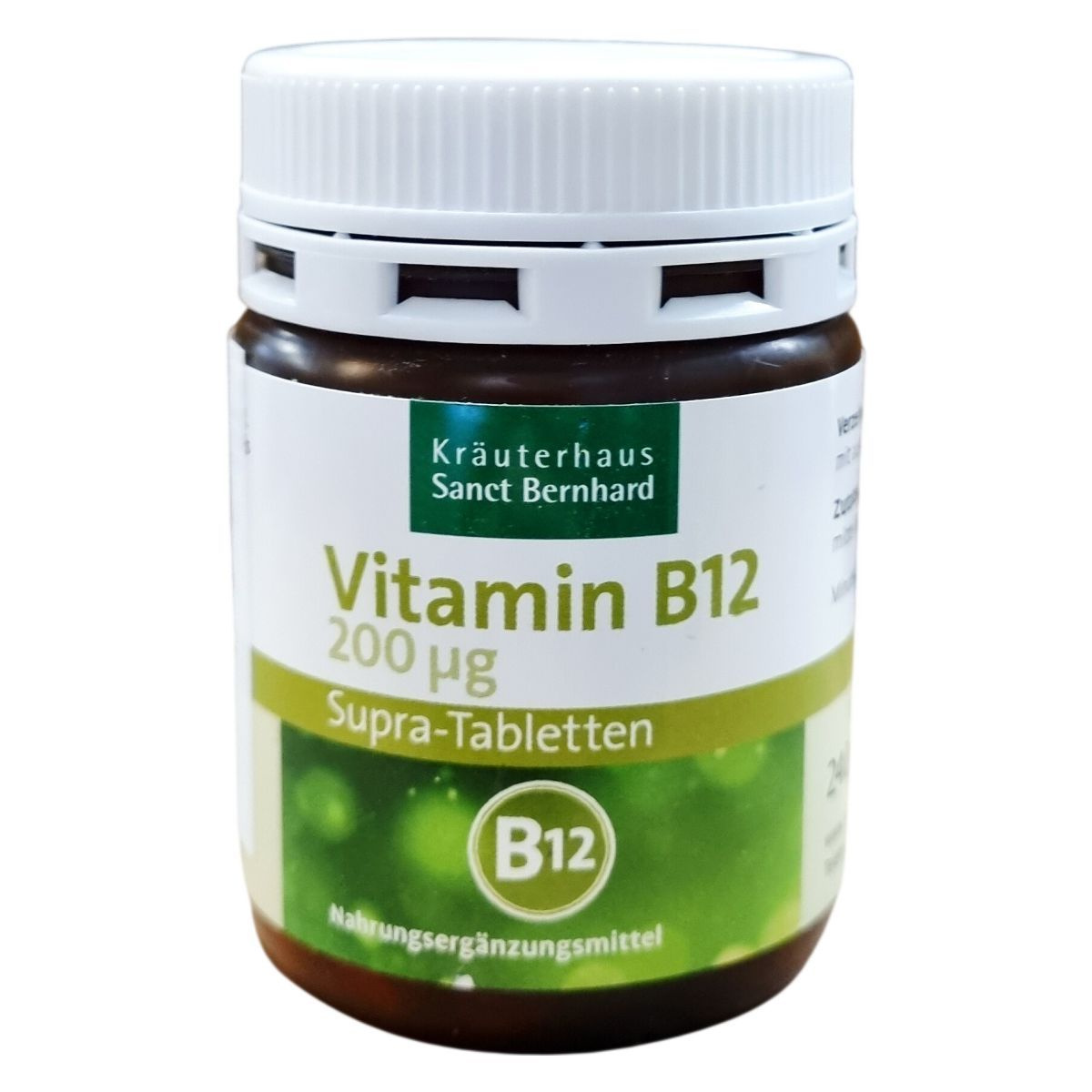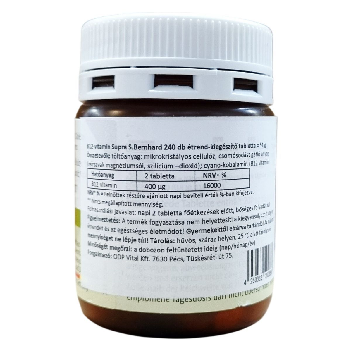 A Kräuterhaus Sanct Bernhard Vitamin B12 Supra-Tabletten étrend-kiegészítő készítmény 240 tablettát tartalmaz. A tabletták fő összetevője a cyano-kobalamin, amely B12-vitaminként ismert. A termék töltőanyagként mikrokristályos cellulózt, csomósodást gátló anyagként pedig magnézium-sztearátot és szilícium-dioxidot tartalmaz. Az ajánlott napi bevitel szerint két tabletta 400 mikrogramm B12-vitamint biztosít, amely a felnőttek ajánlott napi beviteli értékének 16 000%-a. A használati javaslat szerint a tablettákat főétkezések előtt, elegendő mennyiségű folyadékkal ajánlott bevenni. A termék fogyasztása nem helyettesíti a kiegyensúlyozott és vegyes étrendet, valamint az egészséges életmódot. A készítmény gyermekektől elzárva tartandó és az ajánlott napi adagot nem szabad túllépni. Tárolása hűvös, száraz helyen, 25 °C alatt történjen.