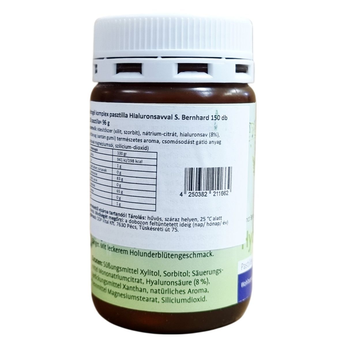 Hidrogél komplex pasztilla hialuronsavval, amely bodzavirág ízesítéssel készül, és jótékony hatással van a torokra és a hangra. A termék 150 darab pasztillát tartalmaz, nettó tömege 96 g, Németországban készült.