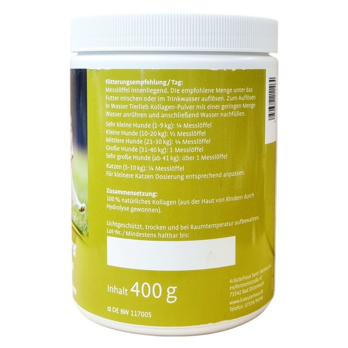 A tierlieb Kollagén por természetes kollagén peptideket tartalmaz, amelyek magas biológiai hasznosulással juthatnak el a szervezetbe. A termék különösen javasolt a mozgásszervi rendszer, így az izmok, ízületi porcok, inak és szalagok támogatására. A kollagén marhabőrből származik, amely hidrolízissel készül. Az adagolás rugalmasan alkalmazkodik a kutyák és macskák testtömegéhez. A por könnyen keverhető az ételbe vagy feloldható ivóvízben, előzőleg kevés vízzel elkeverve. A termék tárolása fénytől védve, száraz helyen ajánlott, a minőséget meghatározott ideig megőrzi. Származási helye Németország.