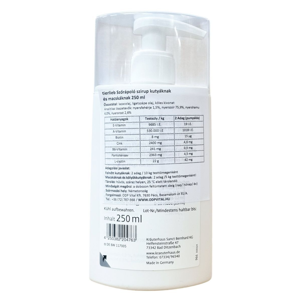 Az ízletes étrend-kiegészítő szirup hatóanyagai vitalitást és fényt kölcsönöznek a kedvencek szőrzetének.