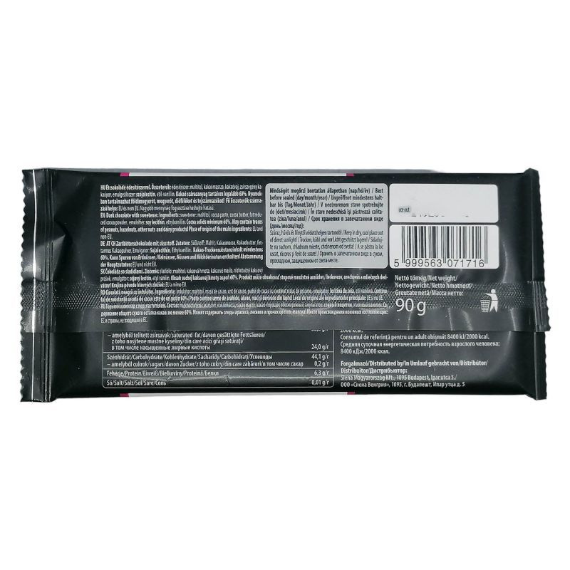 Édesítőszer: maltitol, kakaómassza, kakaóvaj, zsírszegény kakaópor, emulgeálószer: szójalecitin, etil-vanillin. Kakaó szárazanyag tartalom legalább 60%. Nyomokban tartalmazhat földimogyorót, mogyorót, dióféléket és tejszármazékot! Fő összetevők származási helye: EU és nem EU.