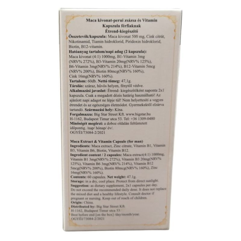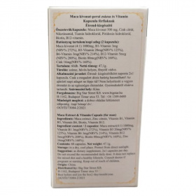 Hatóanyag tartamom napi 2 kapszula: Maca kivonat: 1000 mg, B1-Vitamin: 3mg, B3-Vitamin: 20mg, B6-Vitamin: 3mg, B12-Vitamin: 5mcg, Biotin: 80mcg, Cink 16mg.