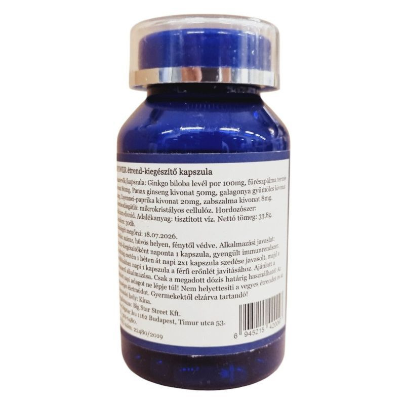 1 db kapszula tartalmaz: Ginkgo Biloba levélpor 100mg, fűrészpálma termés kivonat 80mg, Panax Ginzeng kivonat 50mg, galagonya gyümölcs kivonat 24mg, Cayenne-i paprika kivonat 20mg, zabszalma kivonat 8 mg.