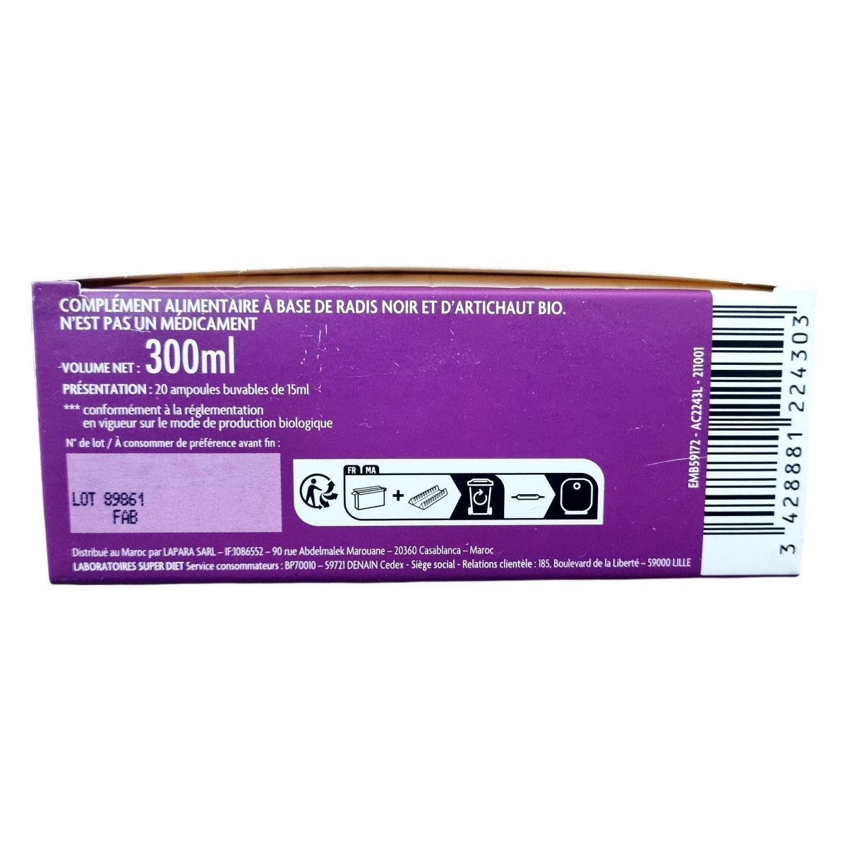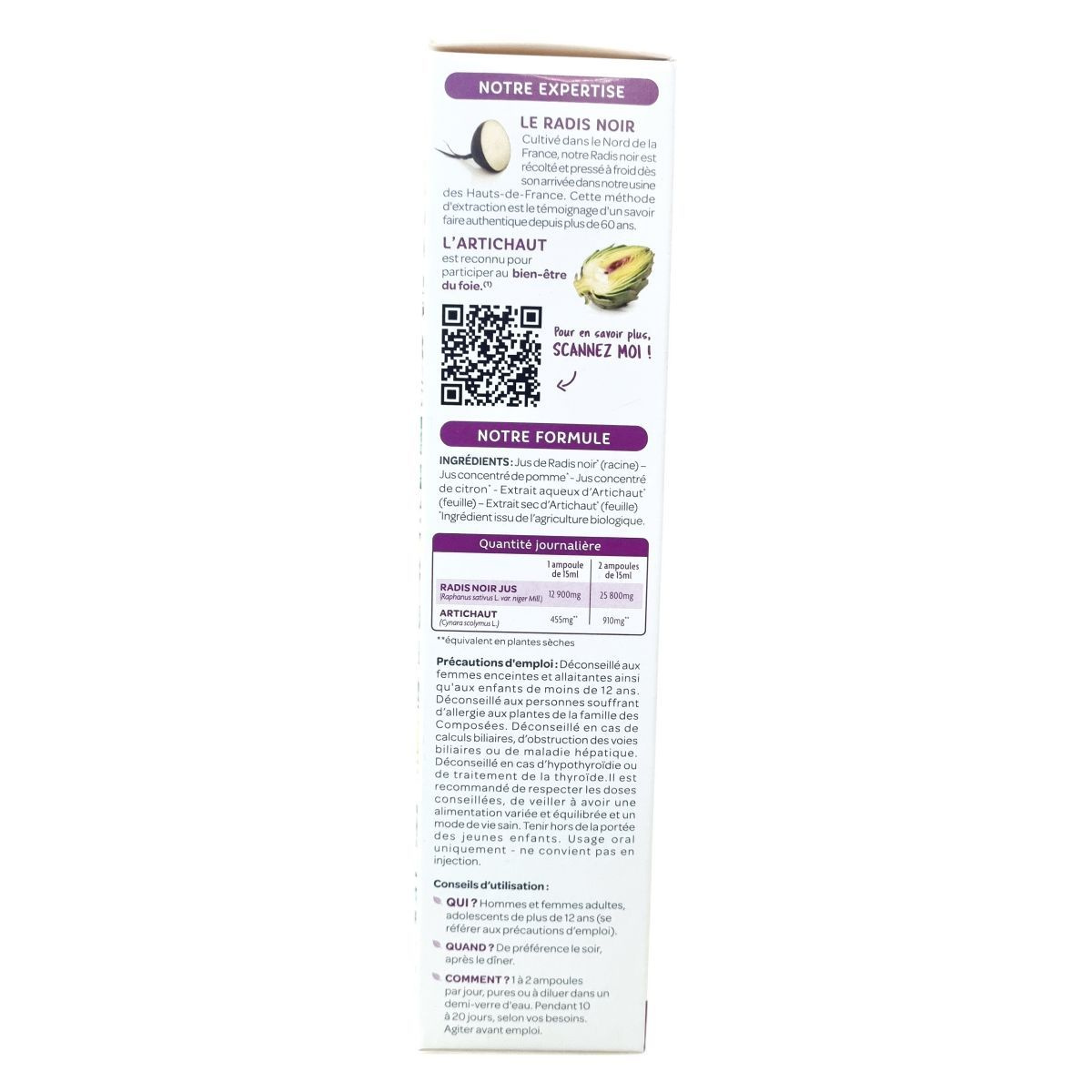 A termék fekete retekből és articsókából készült bio növényi koncentrátum, melynek alapanyagai Észak-Franciaországban, a gyártó közelében termesztett és hidegen sajtolt fekete retek, valamint levél- és száraz kivonat formában használt articsóka. A hidegsajtolásos módszer több mint 60 éves tapasztalatot tükröz. A formula nem tartalmaz alkoholt, tartósítószert és színezőanyagot, az összetevők mind biogazdálkodásból származnak. A termék használata javasolt felnőtt férfiaknak, nőknek és 12 éves kortól serdülőknek, különösen májvédelmi célból. Az ampullák könnyen nyithatóak, és használat előtt fel kell rázni őket. A termék kizárólag orális alkalmazásra készült, nem alkalmas injekciós beadásra. A precíz adagolás betartása és az egészséges életmód fenntartása ajánlott a készítmény alkalmazása mellett.