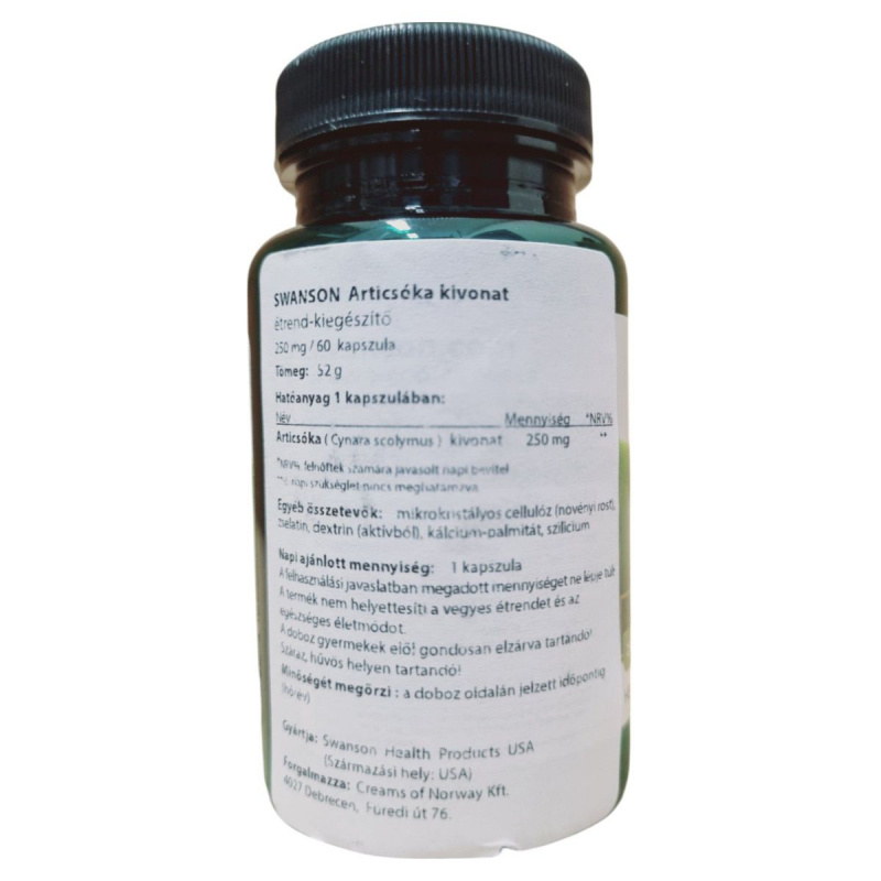 A SWANSON Articsóka kivonat egy étrend-kiegészítő, amely 250 mg articsóka kivonatot tartalmaz kapszulánként. Az articsóka kivonatot a Cynara scolymus növény leveléből nyerik, és standardizált formában tartalmazza a minimum 2.5% caffeoylquinic savat. A termék egyéb összetevői közé tartozik a mikrokristályos cellulóz, zselatin, dextrin, kálcium-palmitát és szilícium. A termék származási helye az USA, és a Creams of Norway Kft. forgalmazza Magyarországon. A termék használata során fontos, hogy a javasolt napi adagot ne lépjük túl, és tartsuk távol gyermekektől. A kapszulákat száraz, hűvös helyen kell tárolni.