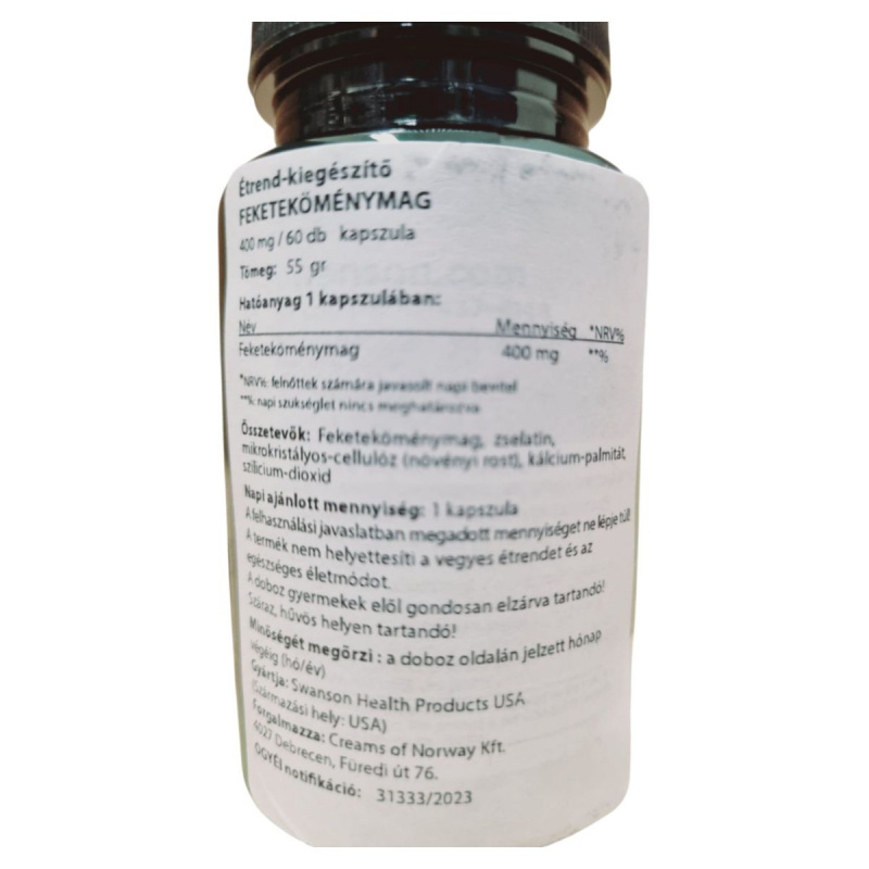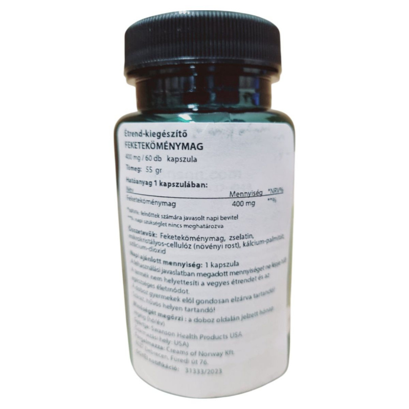 A Swanson Feketeköménymag étrend-kiegészítő kapszula 400 mg feketeköménymagot tartalmaz, amelyet a Nigella sativa növény magjaiból nyernek. A termék célja, hogy támogassa az egészséges életmódot, és hozzájárulhat a szervezet általános jólétéhez. A kapszulák zselatinból készülnek, és további összetevőként mikrokristályos-cellulózt, kálcium-palmitátot és szilícium-dioxidot tartalmaznak. A termék az USA-ban készül, és a Creams of Norway Kft. forgalmazza Magyarországon. Az ajánlott napi adag 1 kapszula, amelyet nem szabad túllépni. A termék nem helyettesíti a változatos étrendet, és fontos, hogy gyermekek elől elzárva tartsuk. Tárolása száraz, hűvös helyen javasolt.