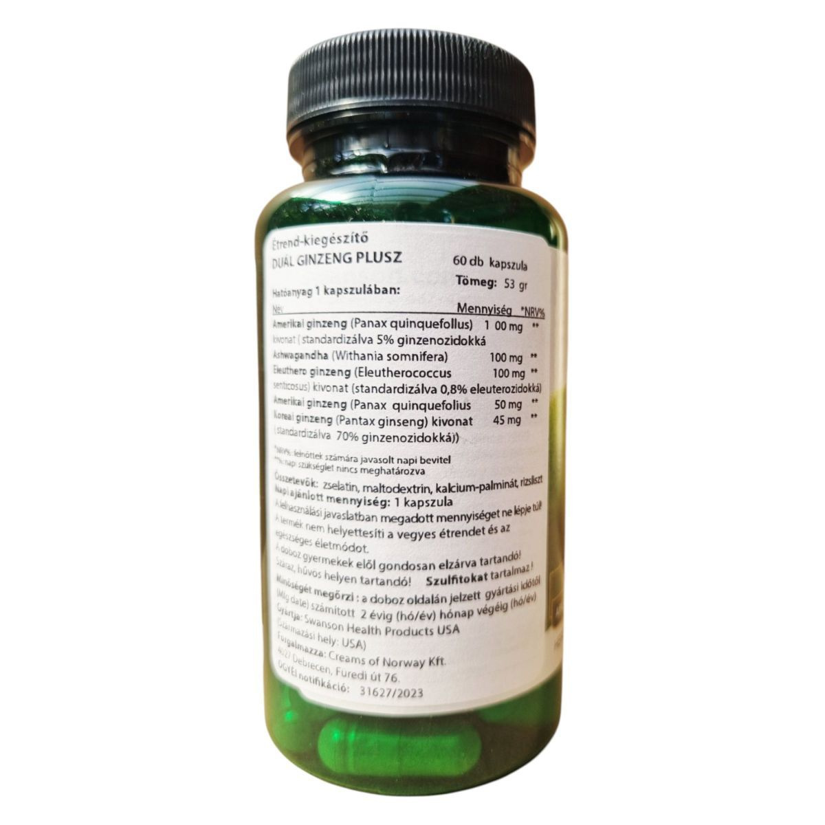 A Swanson Dual Ginseng Plus egy különleges étrend-kiegészítő, amely az amerikai és ázsiai ginzeng kivonatok mellett ashwagandhát is tartalmaz. Ezek a növényi összetevők hozzájárulhatnak az energiaszint fenntartásához és a stressz kezeléséhez. A termék napi ajánlott mennyisége 1 kapszula, amelyet nem szabad túllépni. Az összetevők között található zselatin, maltodextrin, kalcium-palminát és rizsliszt. A termék szulfitokat tartalmaz, ezért fontos, hogy a dobozt gyermekek elől elzárva tartsuk, és száraz, hűvös helyen tároljuk. A termék nem helyettesíti a vegyes étrendet és az egészséges életmódot. Gyártja a Swanson Health Products, forgalmazza a Creams of Norway Kft.