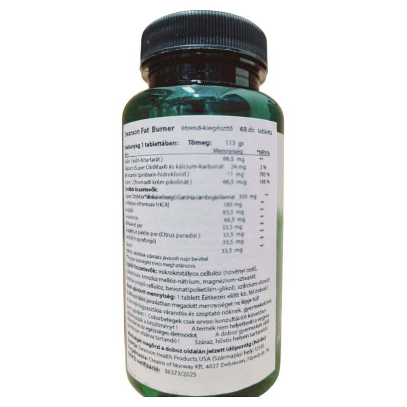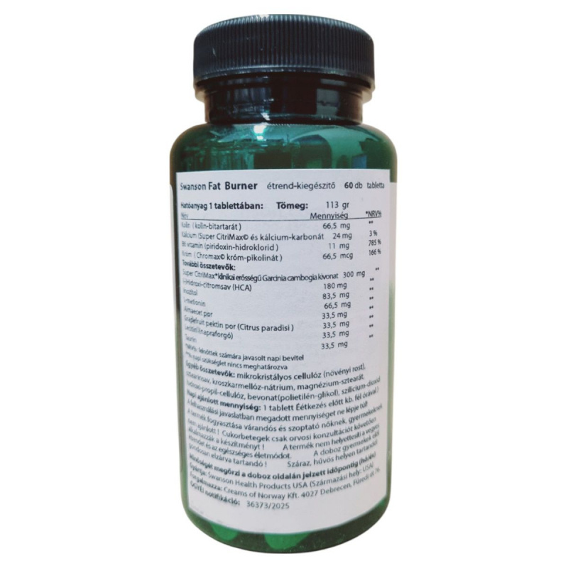 A Swanson Fat Burner étrend-kiegészítő tabletták olyan hatóanyagokat tartalmaznak, mint a Garcinia cambogia kivonat, króm, B6 vitamin és kolin, amelyek hozzájárulhatnak a testsúlycsökkentés támogatásához. A termék napi adagja 1 tabletta, amelyet étkezés előtt fél órával ajánlott bevenni. A termék különösen figyelmet fordít a biztonságos használatra, ezért nem ajánlott várandós és szoptató nőknek, gyermekeknek és serdülőknek. Cukorbetegek számára orvosi konzultáció javasolt a fogyasztás előtt. A termék nem helyettesíti a vegyes étrendet és az egészséges életmódot, és gyermekek elől elzárva tartandó. A tárolás során ügyelni kell arra, hogy száraz, hűvös helyen legyen elhelyezve.