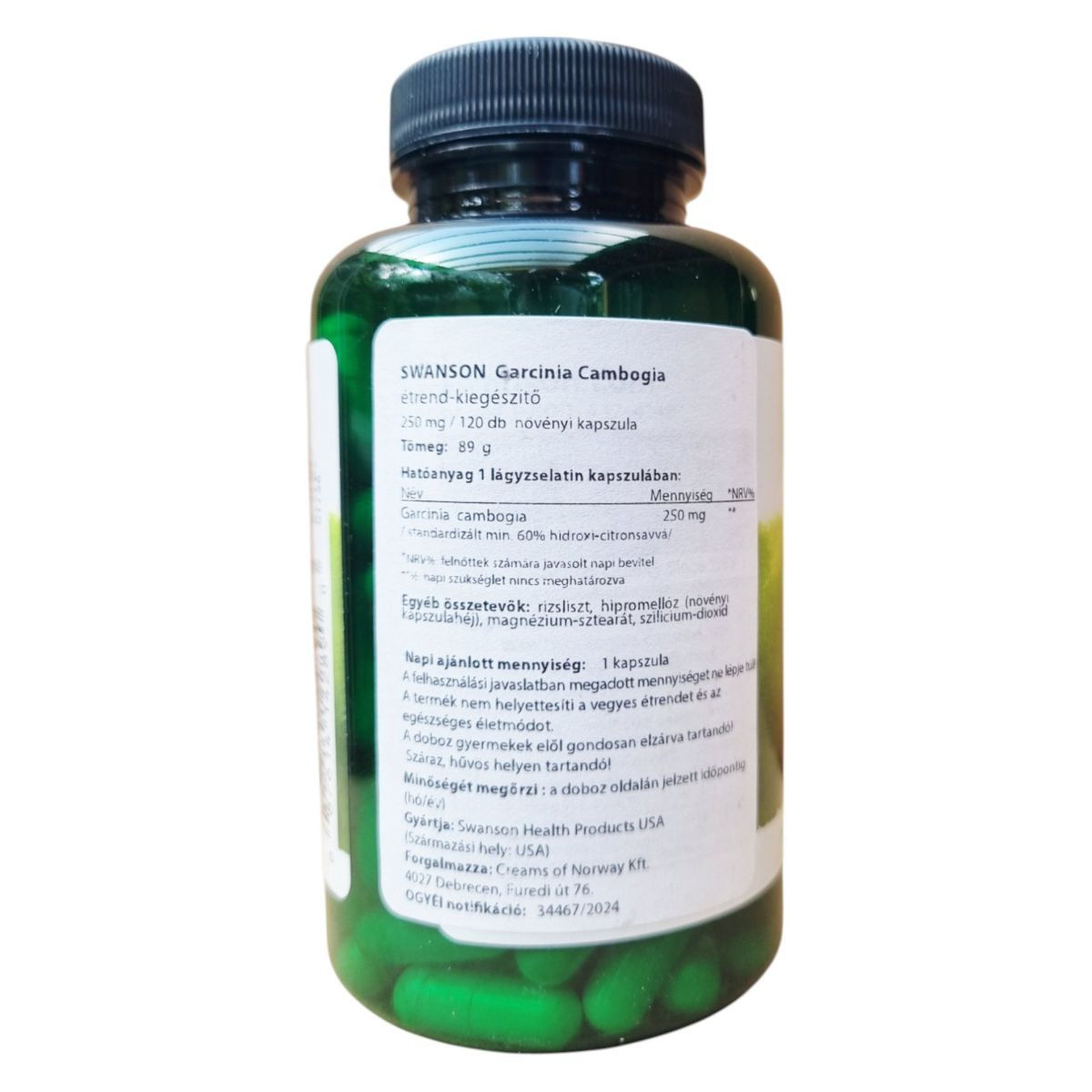 A SWANSON Garcinia Cambogia egy növényi alapú étrend-kiegészítő, amelyet a testsúlykezelés támogatására fejlesztettek ki. A termék 120 növényi kapszulát tartalmaz, mindegyik 250 mg Garcinia Cambogia kivonattal, amely standardizált minimum 60% hidroxi-citromsavval. Az összetevők között található rizsliszt, hipromellóz, magnézium-sztearát és szilícium-dioxid. A termék vegetáriánus étrendbe illeszthető. Fontos, hogy a javasolt napi mennyiséget ne lépje túl, és a terméket gyermekek elől elzárva, száraz, hűvös helyen tárolja. Az OGYÉI notifikációs száma 34467/2024.