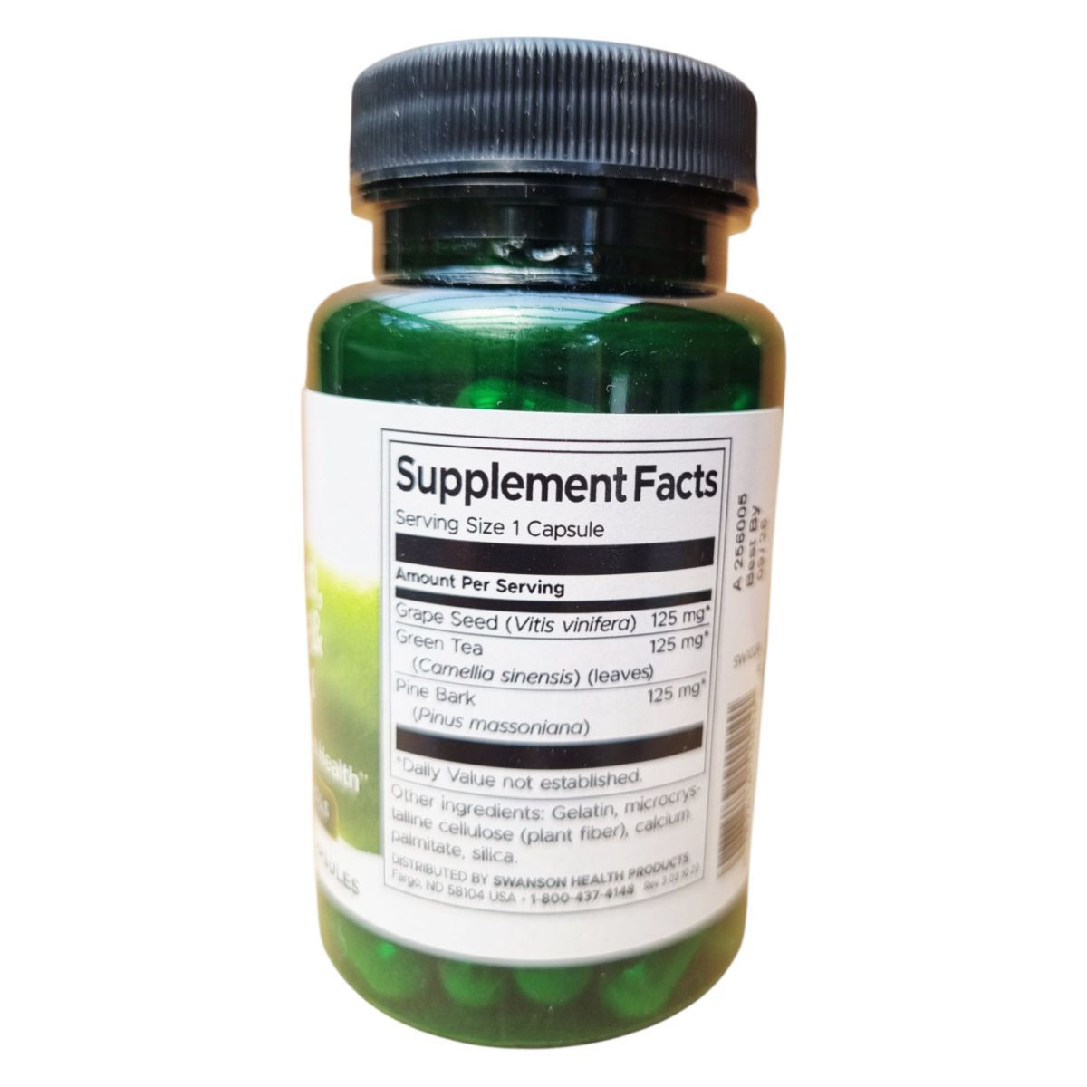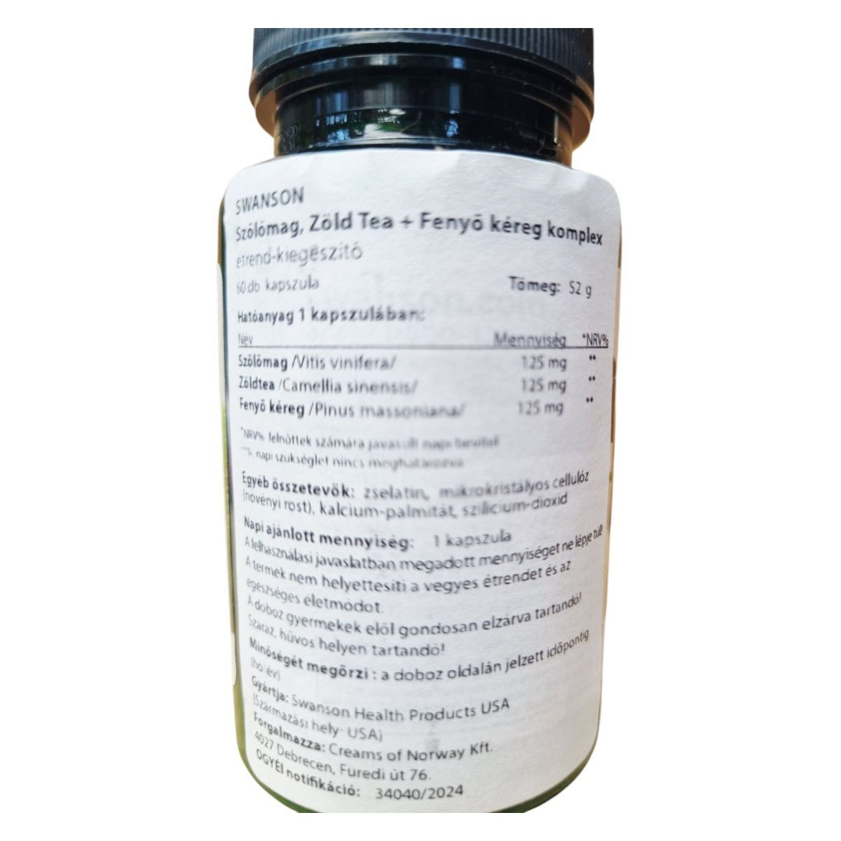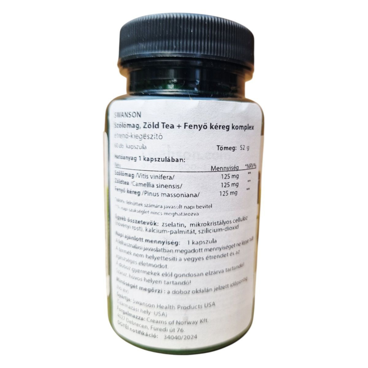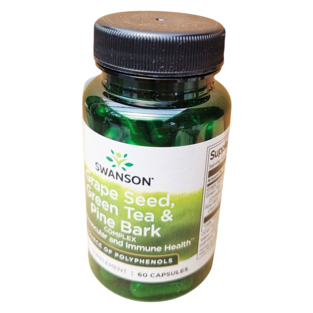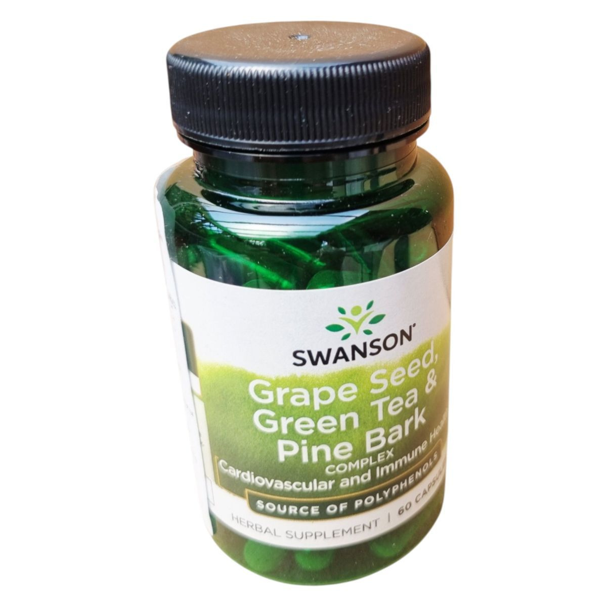 A Swanson Szőlőmag, Zöld Tea + Fenyő kéreg komplex egy olyan étrend-kiegészítő, amely három különböző növényi kivonatot tartalmaz. A szőlőmag, zöld tea és fenyő kéreg mindegyike ismert lehet polifenol tartalmáról, amelyek hozzájárulhatnak a szív- és érrendszeri, valamint az immunrendszer egészségének támogatásához. A termék 60 kapszulát tartalmaz, és napi egy kapszula fogyasztása javasolt. A termék összetevői között megtalálható a zselatin, mikrokristályos cellulóz, kalcium-palmitát és szilícium-dioxid. Fontos megjegyezni, hogy a termék nem helyettesíti a vegyes étrendet és az egészséges életmódot, és száraz, hűvös helyen kell tárolni.