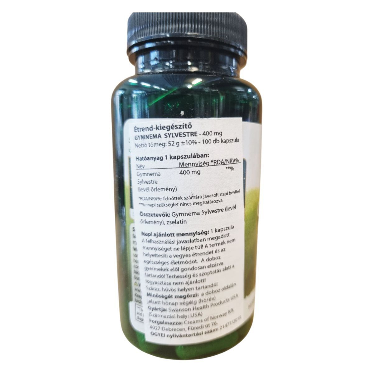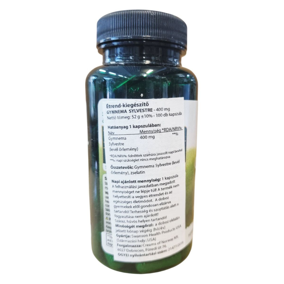 A Swanson Full Spectrum Gymnema Sylvestre Leaf egy gyógynövény alapú étrend-kiegészítő, amely 400 mg Gymnema Sylvestre levél őrleményt tartalmaz kapszulánként. A termék célja, hogy támogassa a vércukorszint egyensúlyát. A kapszulák zselatint tartalmaznak, és a termék 100 kapszulás kiszerelésben kapható. A termék használata nem ajánlott terhesség és szoptatás alatt, és fontos, hogy a javasolt napi mennyiséget ne lépje túl. A termék forgalmazója a Creams of USA Kft., és az OGYÉI nyilvántartási száma 21477/2019.