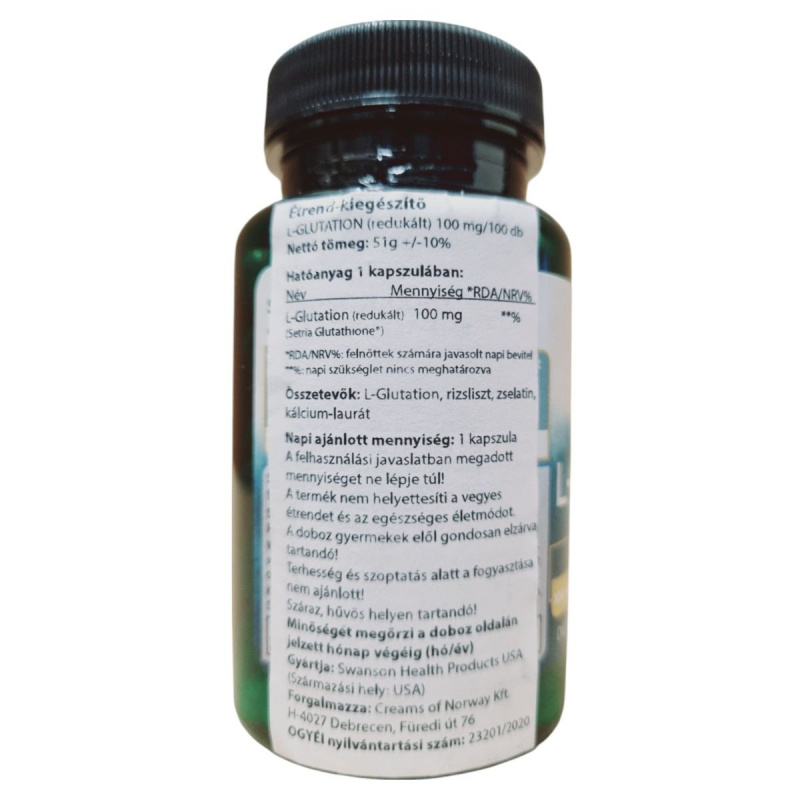 Az L-Glutation (redukált) étrend-kiegészítő a Swanson Health Products által gyártott termék, amely kapszulánként 100 mg L-Glutationt tartalmaz. A termék célja, hogy támogassa a szervezet antioxidáns védelmét. Az összetevők között megtalálható a rizsliszt, zselatin és kalcium-laurát. A termék használata során fontos betartani az ajánlott napi mennyiséget, és figyelembe venni a figyelmeztetéseket, különösen terhesség és szoptatás alatt. A terméket száraz, hűvös helyen kell tárolni, és gyermekek elől elzárva tartani. A forgalmazó a Creams of Norway Kft, Debrecenben található.