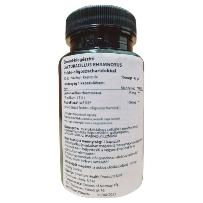 A Swanson Health Products LACTOBACILLUS RHAMNOSUS étrend-kiegészítő 50 db növényi kapszulát tartalmaz, amely Lactobacillus rhamnosus probiotikumot és NutraFlora scFOS frukto-oligoszacharidokat tartalmaz. Ezek az összetevők hozzájárulhatnak az emésztőrendszer egészségének támogatásához. A termék mikrokristályos cellulózból, növényi kapszulából, szilícium-dioxidból és magnézium-sztearátból készül. A napi ajánlott mennyiség 1 kapszula, amelyet nem szabad túllépni. A termék nem helyettesíti a vegyes étrendet és az egészséges életmódot, és gyermekek elől elzárva tartandó. A termék minőségét a doboz oldalán jelzett hónap végéig őrzi meg.