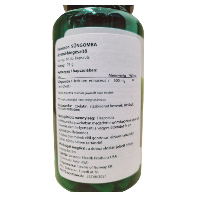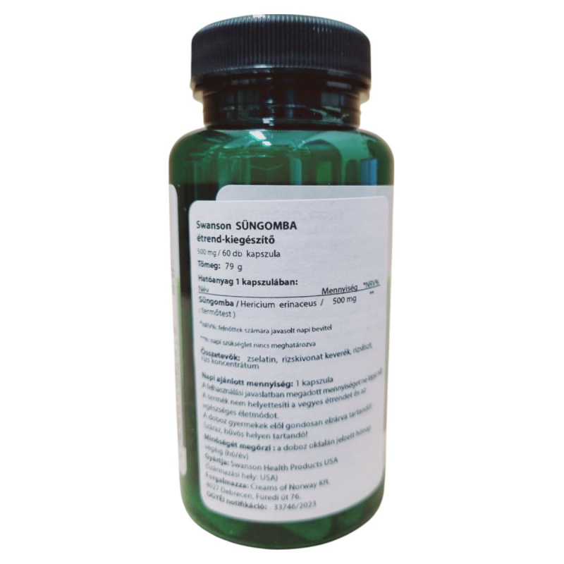 A Swanson SÜNGOMBA étrend-kiegészítő kapszula formájában kínálja a Hericium erinaceus, más néven süngomba, termőtestét. Ez a gomba hozzájárulhat az egészséges életmód támogatásához, és a napi étrend kiegészítésére szolgálhat. A termék zselatin kapszulában érkezik, amely rizskivonat keveréket, rizslisztet és rizs koncentrátumot is tartalmaz. A termék használata során fontos, hogy ne lépjük túl az ajánlott napi mennyiséget, és tartsuk távol gyermekektől. A Swanson Health Products által gyártott termék az USA-ból származik, és a Creams of Norway Kft. forgalmazza Magyarországon.