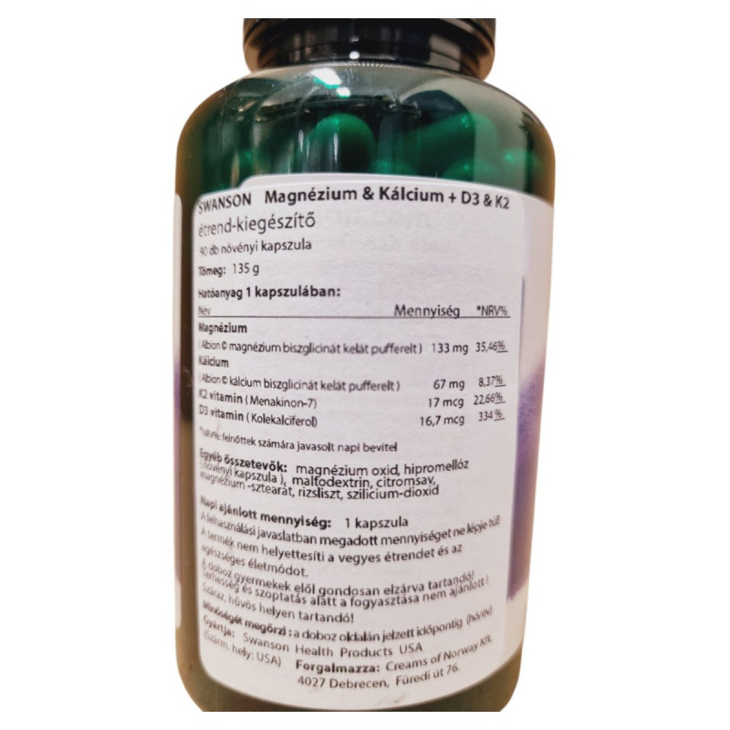 A SWANSON Magnézium + Kálcium + D3 + K2 étrend-kiegészítő egy komplex formula, amely magnéziumot és kálciumot tartalmazhat, amelyek fontosak lehetnek a csontok és az izmok normál működéséhez. A D3 és K2 vitaminok hozzájárulhatnak a kalcium megfelelő felszívódásához és hasznosulásához a szervezetben. A termék növényi kapszulák formájában kapható, így vegetáriánusok számára is alkalmas lehet. A termék használata során fontos betartani az ajánlott napi mennyiséget, és figyelni arra, hogy a termék nem helyettesíti a kiegyensúlyozott étrendet és az egészséges életmódot.