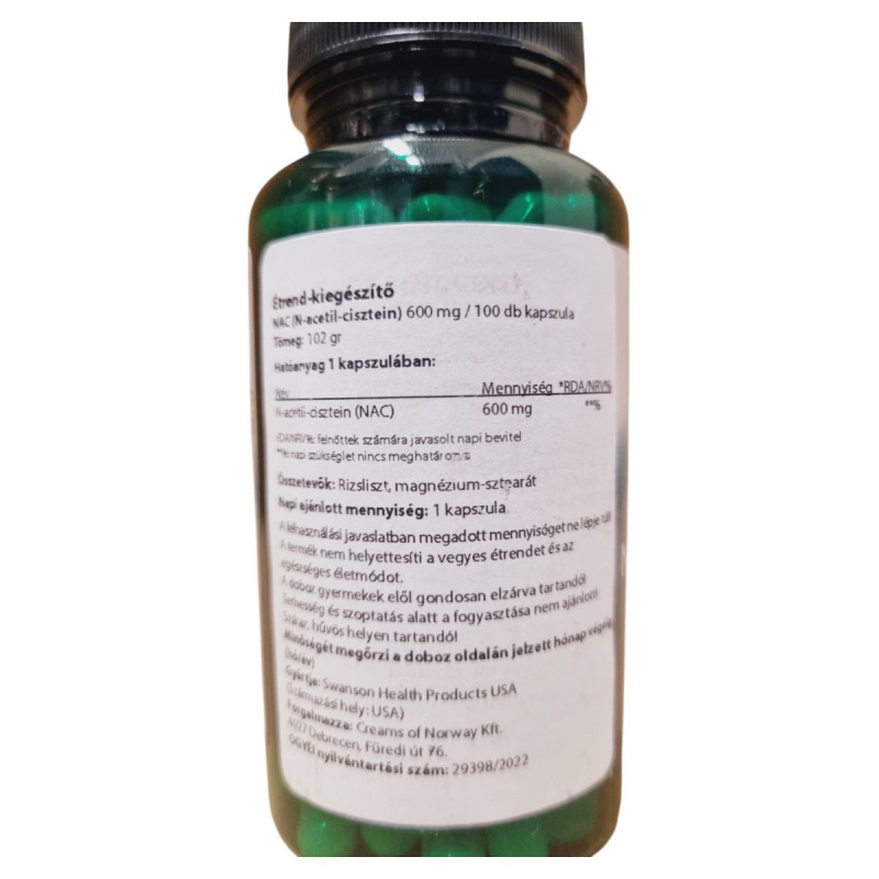 A Swanson NAC (N-acetil-cisztein) étrend-kiegészítő kapszula 600 mg hatóanyagot tartalmaz, amely antioxidáns hatásával hozzájárulhat a szervezet egészségének támogatásához. A termék rizslisztet és magnézium-sztearátot tartalmaz, és napi egy kapszula fogyasztása javasolt. Fontos, hogy a termék nem helyettesíti a vegyes étrendet és az egészséges életmódot, valamint terhesség és szoptatás alatt nem ajánlott a fogyasztása. A terméket száraz, hűvös helyen kell tárolni, és gyermekek elől elzárva tartani. A Swanson Health Products által gyártott termék OGYÉI nyilvántartási száma: 29398/2022.