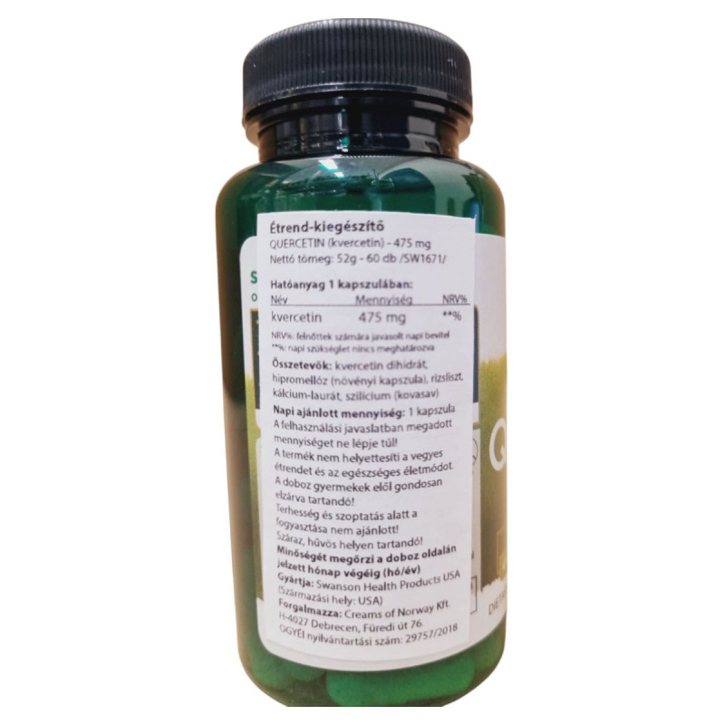 A Swanson QUERCETIN étrend-kiegészítő kapszulánként 475 mg kvercetint tartalmaz, amely egy természetes flavonoid. A termék növényi alapú kapszulában érkezik, és a kvercetin hozzájárulhat a szervezet antioxidáns védelmének támogatásához. A termék nem helyettesíti a vegyes étrendet és az egészséges életmódot. Fontos, hogy a javasolt napi adagot ne lépje túl, és a terméket gyermekek elől elzárva tartsa. Terhesség és szoptatás alatt a fogyasztása nem ajánlott. A termék minőségét a doboz oldalán jelzett hónap végéig őrzi meg. Gyártja a Swanson Health Products az USA-ban, és forgalmazza a Creams of Norway Kft. Magyarországon.