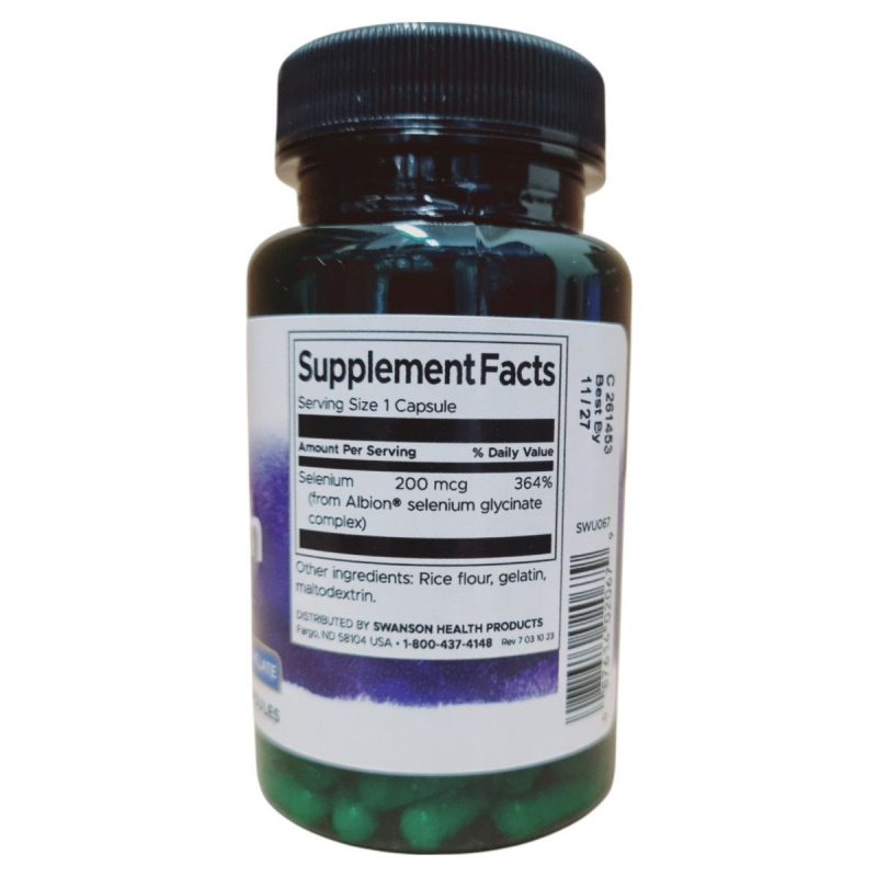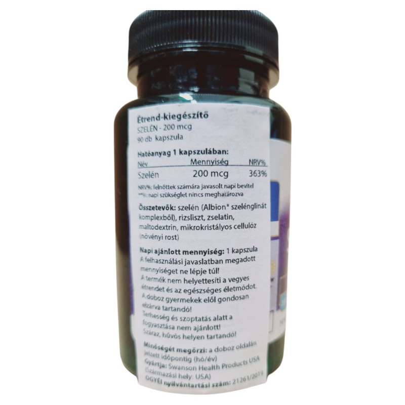 A Swanson Szelén kapszula 200 mcg szelént tartalmaz, amely az Albion szelénglinát komplexből származik. A szelén hozzájárulhat az immunrendszer normál működéséhez és a sejtek oxidatív stresszel szembeni védelméhez. A termék rizslisztet, zselatint, maltodextrint és mikrokristályos cellulózt is tartalmaz. A napi ajánlott mennyiség 1 kapszula, amely a felnőttek számára javasolt napi bevitel 363%-át fedezi. A termék nem helyettesíti a vegyes étrendet és az egészséges életmódot, és terhesség, valamint szoptatás alatt nem ajánlott a fogyasztása. A kapszulákat száraz, hűvös helyen kell tárolni, és gyermekek elől elzárva tartani. A termék az USA-ban készült, és az OGYÉI nyilvántartási száma 21261/2019.