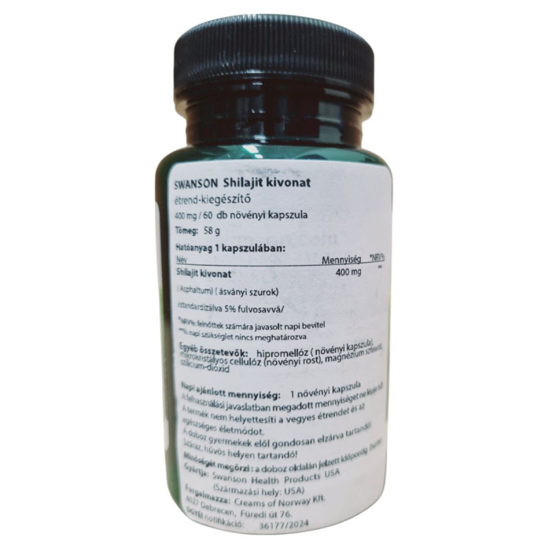 A SWANSON Shilajit kivonat egy étrend-kiegészítő, amely 400 mg shilajit kivonatot tartalmaz kapszulánként, és standardizálva van 5% fulvosavvá. A termék hipromellóz alapú növényi kapszulában érkezik, amely mikrokristályos cellulózt, magnézium-sztearátot és szilícium-dioxidot is tartalmaz. A napi ajánlott adag 1 kapszula, amely segíthet az általános jólét és vitalitás támogatásában. Fontos, hogy a termék nem helyettesíti a vegyes étrendet és az egészséges életmódot. Gyermekek elől elzárva, száraz, hűvös helyen tárolandó. A terméket a Swanson Health Products gyártja, és az OGYÉI notifikációs száma 36177/2024.