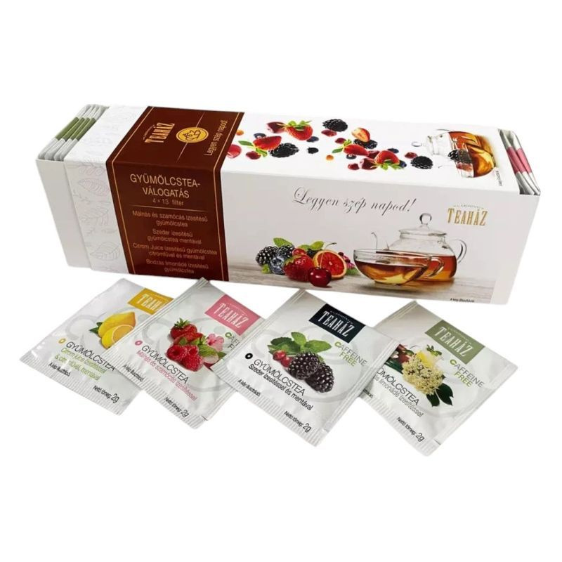 Málna és szamóca ízesített gyümölcstea, Citrom juice ízesített gyümülcstea, Szeder menta ízesített gyümülcstea, Bodzás limonádé ízesített gyümülcstea, Kétoldalon kíhúzható paraktikus díszdobozban, matricával díszített. Méret:24,5*7,2*7,6cm. 4 féle filteres gyümölcstea-válogatás. 4*13db filter/doboz.