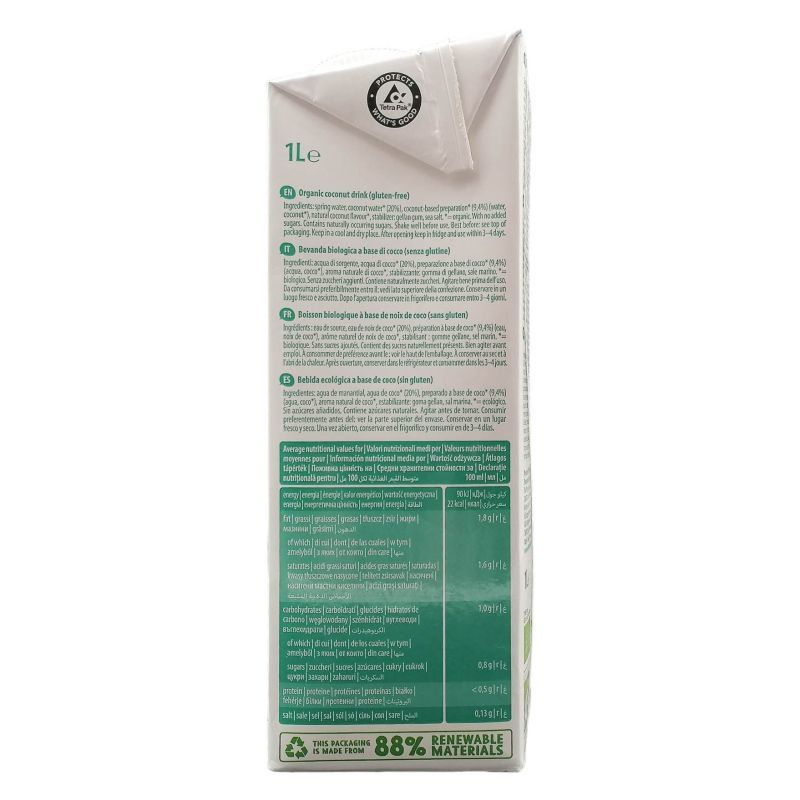 Tápanyag tartalom: Energia 90 kJ, 22 kcal, Zsír 1,8 g, amelyből telített zsírsavak 1,6 g, Szénhidrát 1,0 g, amelyből cukor 0,8 g, Fehérje 0,5 g , Só 0,13 g. Összetevők: Forrásvíz, kókuszvíz(20%) kókusztej* (9,4%) kókuszdió(2,5%)*, víz), természetes kókusz aroma* stabilizátor:gellángumi, só* *=ökológiai. Hozzáadott cukor nélkül. Természetes cukrokat tartalmaz.