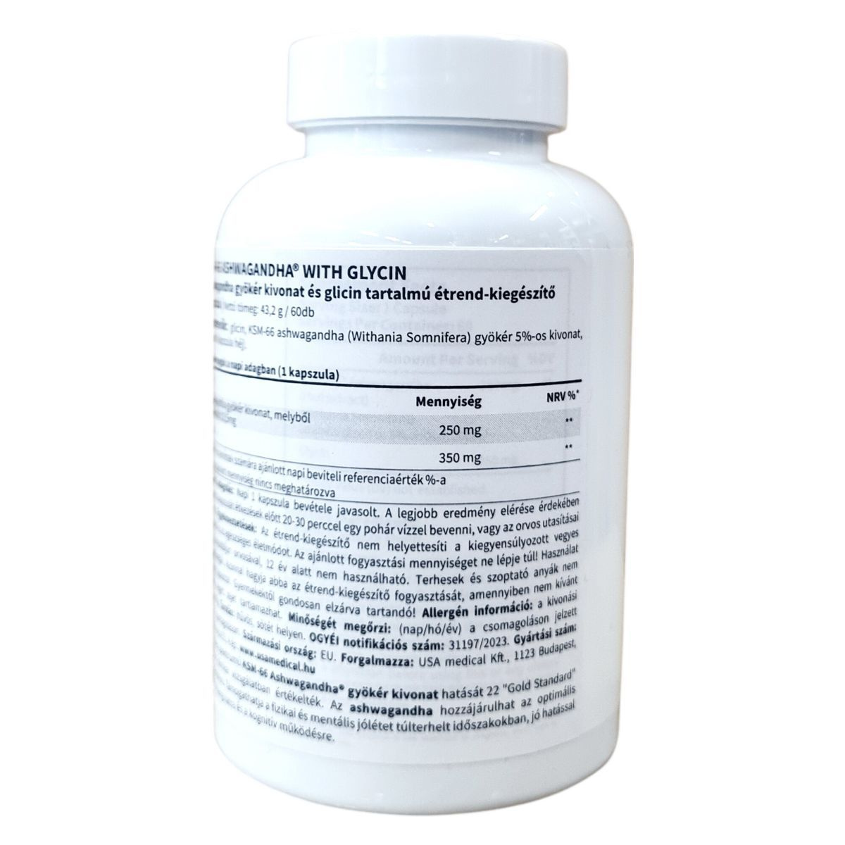 glicin, KSM-66 ashwagandha (Withania Somnifera) gyökér 5%-os kivonat, zselatin (kapszula héj)