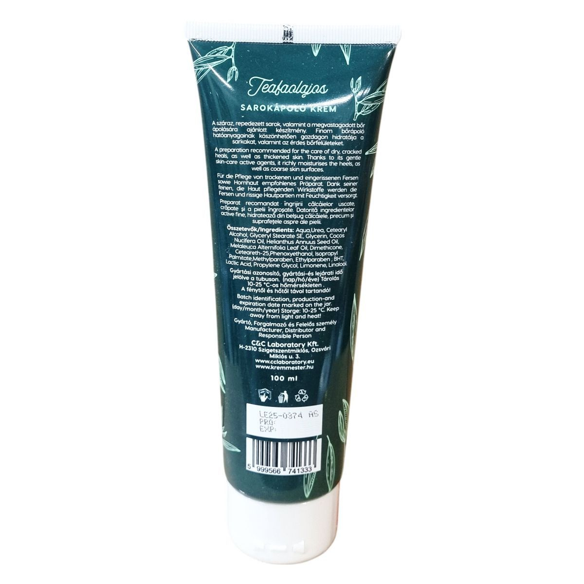 Ez a sarokápoló krém száraz, repedezett és megvastagodott bőr ápolására készült, hatékonyan hidratálja és puhítja a bőrfelületeket. A teafaolaj és egyéb bőrápoló összetevők gazdag ellátást nyújtanak, javítva a bőr állapotát. A termék gyártási azonosítója, valamint a gyártási és lejárati idő a tubuson található (nap/hó/év formátumban). Használat közben kerülje a termék közvetlen napfénynek és hőhatásnak való kitettségét, a megőrzött hatékonyság érdekében. Kiszerelése 100 ml.