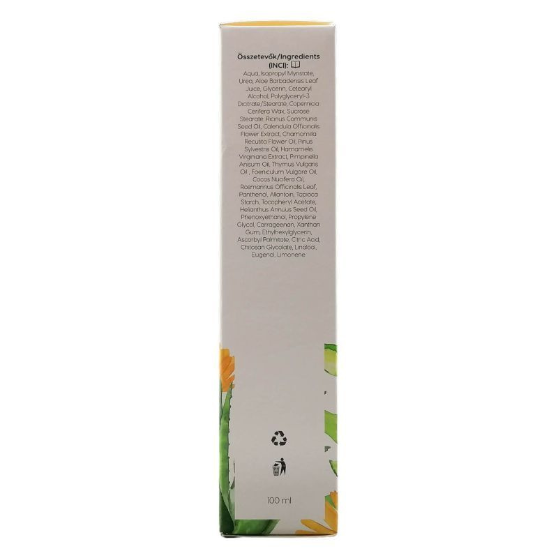 Külső környezeti hatásoktól sérült, igénybevett, regenerálásra szoruló bőr ápolására ajánlott. A termékben magas koncentrációban megtalálható aloe vera kivonat hidratálja a bőrt, segítheti a bőr hámosodását és az esetleges gyulladások enyhítését akár a napégés, vagy horzsolások esetén. Az aloe vera ezen felül kiváló baktérium,-gomba és vírusölő hatással is rendelkezik. A körömvirág kivonat segíti a sebek gyógyulását és hegesedését, valamint a gyulladáscsökkentő és viszketéscsillapító hatású.Aqua, Isopropyl Myristate, Urea, Aloe Barbadensis Leaf Juice, Glycerin, Cetearyl Alcohol, Polyglyceryl-3 Dicitrate/Stearate, Copernicia Cerifera Wax, Sucrose Stearate, Ricinus Communis Seed Oil, Calendula Officinalis Flower Extract, Chamomilla Recutita Flower Oil, Pinus Sylvestris Oil, Hamamelis Virginiana Extract, Pimpinella Anisum Oil, Thymus Vulgaris Oil , Foeniculum Vulgare Oil, Cocos Nucifera Oil, Rosmarinus Officinalis Leaf, Panthenol, Allantoin, Tapioca Starch, Tocopheryl Acetate, Helianthus Annuus Seed Oil, Phenoxyethanol, Propylene Glycol, Carrageenan, Xanthan Gum, Ethylhexylglycerin, Ascorbyl Palmitate, Citric Acid, Chitosan Glycolate, Linalool, Eugenol, Limonene.