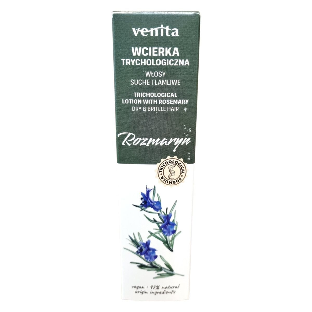 A Venita Trichological Lotion rozmaring kivonattal készült, kifejezetten száraz és töredezett hajra. A termék formulája trichológiai tesztekkel igazolt hidratáló hatással rendelkezik. Rendszeres használata javíthatja a haj állapotát, növelheti rugalmasságát és természetes fényt adhat. A rozmaring tradicionális gyógynövény, melyet évezredek óta használnak a hajápolásban; vitaminokban és ásványi anyagokban gazdag. A hajszesz újrahasznosított palackban kerül forgalomba, környezettudatos, vegán formulával. A haj könnyebben kifésülhetővé és formázhatóvá válhat, miközben a természetes szépségét is megőrzi.