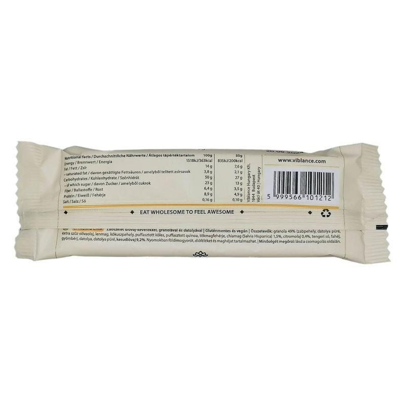 Granola (zabpehely, datolyapaszta, extra szűz olívaolaj, lenmag, kókuszpehely, puffasztott köles, puffasztott quinoa, tökmagfehérje, chiamag 0.8%, citromolaj 0.2%, tengeri só, fahéj, gyömbér), datolya, datolyapaszta, kesudióvaj 9.2%.