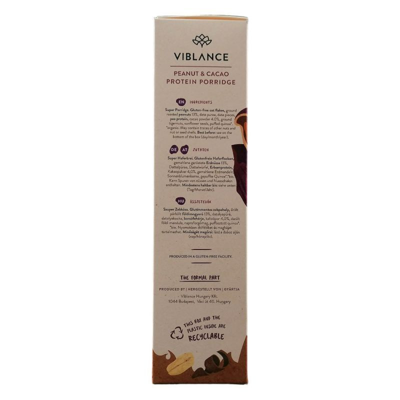 Összetevők: Gluténmentes zabpehely, őrölt pirított földimogyoró 13%, datolyapüré, datolyakocka, borsófehérje, kakaópor 4%, földi mandula, napraforgómag, puffasztott quinoa* Pörkölt földimogyoró és kakaó krémes keveréke, egy csomó szuperélelmiszerrel, amik segítenek abban, hogy evés közben egyensúlyba kerülj önmagaddal és a világgal… Felejtsd el a kellemetlen ízű sportporokat, gondoskodj a megfelelő fehérjebevitelről egy krémesen finom zabkásával- reggelire vagy edzés után!