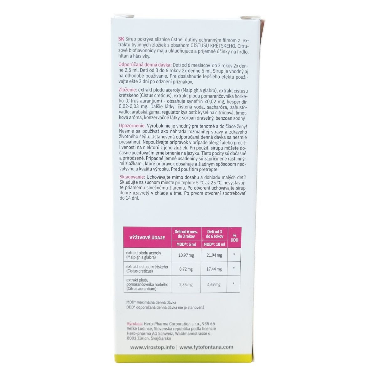 A Fytofontana V Stop Kids szirup három növényi kivonatból, acerola, bodorrózsa (Cistus creticus) és keserű narancs gyümölcs kivonatából áll. A Cistus creticus kivonat védőréteget képezhet a szájüreg nyálkahártyáján, míg a citrusfélék bioflavonoidjai kellemes, nyugtató hatással lehetnek a torok, garat és hangszálak területén. A készítmény lime ízű, tisztított vizet, szacharózt, gumiarabikumot, citromsavat, lime aromát valamint tartósítószereket is tartalmaz, amelyek segíthetik az állag és eltarthatóság megőrzését. A szirup fokozott elővigyázatossággal alkalmazandó terhes és szoptató nők, illetve azok számára, akik allergiásak vagy túlérzékenyek bármely összetevőjére. Használat közben átmeneti enyhe bizsergő érzés előfordulhat, amely természetes. A növényi összetevők miatt előfordulhatnak finom üledékek, melyek nem befolyásolják a termék minőségét. Az adagolás a gyermekek korcsoportja szerint történik, napi 2 vagy 4 adagban, és a kezelést tüneti javulás után célszerű még három napig folytatni a jobb hatékonyság érdekében.