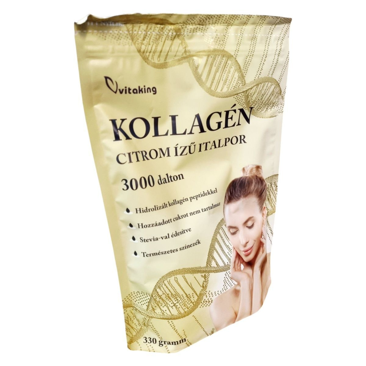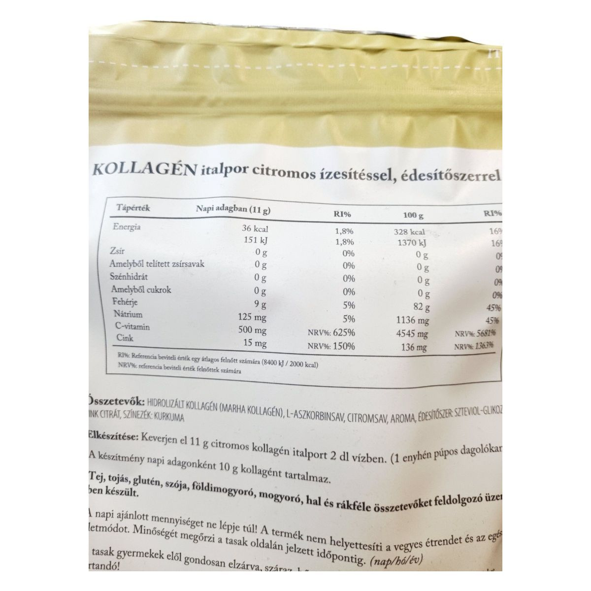 A Vitaking KOLLAGÉN citrom ízű italpor egy speciális étrend-kiegészítő, amely hidrolizált kollagén peptideket tartalmaz. A termék steviával édesített, hozzáadott cukrot nem tartalmaz, és természetes színezéket tartalmaz. A C-vitamin tartalma hozzájárulhat a normál kollagénképződéshez, amely támogathatja az erek, a csontok, a porcok, a fogíny, a bőr és a fogak normál állapotának fenntartását. A termék tej, tojás, glutén, szója, földimogyoró, mogyoró, hal és rákféle összetevőket feldolgozó üzemben készült.
